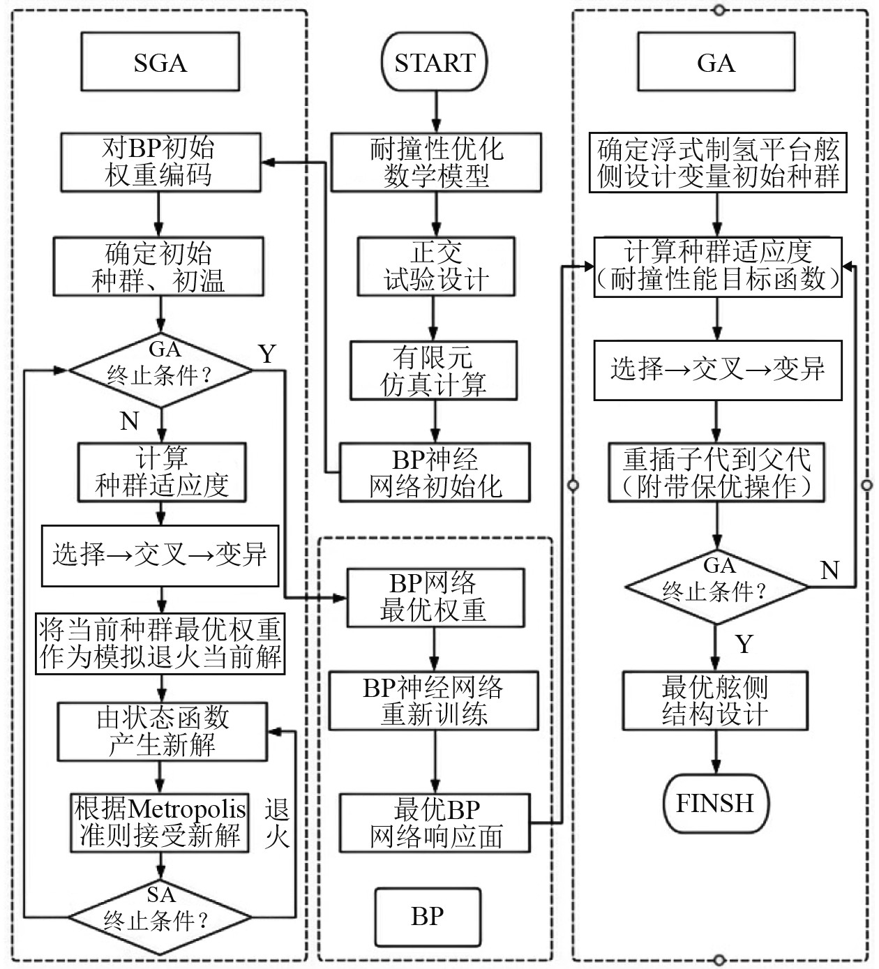 3 浮式制氢平台舷侧结构耐撞性能优化设计 3.1 耐撞性能优化设计方法首先构建耐撞性能优化数学模型,确定关键优化参数;随后运用正交试验法设计实验方案,通过有限元仿真计算获取BP神经网络的训练样本。在网络训练阶段,采用SGA混合算法优化BP神经网络的权值与阈值,并将优化后的权重参数输入到BP算法中进行再训练,由此构建精确的神经网络响应面模型。在最终阶段,通过使用遗传算法(GA)和已经创建的BP网络模型,对浮式制氢平台舷侧结构的耐撞性能进行了优化设计[4 - 11]。优化流程如图8所示。