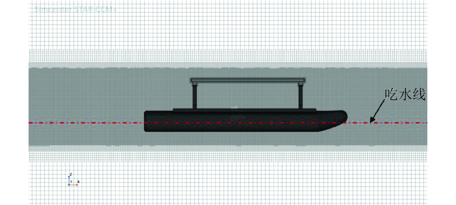 在国内外研究中,CFD技术被广泛应用于模拟船舶水动力性能。杨兴林等[2]设计了一种尾插板,并基于CFD方法实施重叠网格方案模拟船舶在静水中的运动,结果表明设计的尾插板达到减阻目的,为船舶尾插板设计提供参考。邓绍初等[3]采用基于RANS的粘性求解器模拟77.73 m双体船8种航速下的静水阻力和兴波特性,为双体船设计与性能优化提供了理论依据。丁垤涛等[4]基于STAR-CCM+软件,对不同片体间距、不同片体形态和不同斜向航行角度等工况进行数值计算,分析双体船水动力性能,验证了所设计船型在高速航行状态时的优越性。谢云平等[5]运用STAR-CCM+软件探究静水阻力数值方法,对不同槽道参数的船型方案开展数值模拟,结果表明设计的双体槽道船具有良好的阻力性能。陈宇婷等[6]基于STAR-CCM+数值仿真软件,数值模拟小型无人双体船在不同弗劳德数Fr下静水状态和自航状态时的水动力性能,研究为进一步预报双体船的水动力性能提供参考。Park等[7]选用Realizable k-ε和SST k-ω湍流模型对KCS基准船模周围的湍流进行了数值模拟,研究了船舶阻力对壁面附近网格的敏感性,并揭示近壁处理对船舶阻力敏感性的影响。Song等[8]使用CFD软件STAR-CCM+对REGAL杂货船进行全尺寸船舶阻力和自推进数值模拟,得到了模拟全尺寸船舶动力性能的策略。