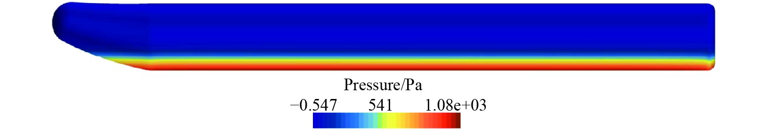 3.2.5 仿真结果分析在STAR-CCM+软件中,对浮筒进行了压力分布的仿真计算,得到了1 kn航速下浮筒的压力云图,如图13所示。可以观察到,浮筒所受的压力主要集中在水面以下的区域。这一压力分布情况与实际情况相符,从而验证了仿真计算结果的准确性。