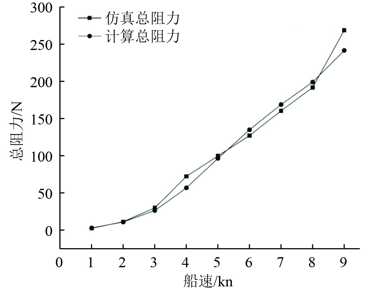 通过STAR-CCM+软件分别对波浪适应双体船在1~9 kn航速下的阻力进行仿真计算。根据1~9 kn航速阻力的仿真结果,绘制出无人船的阻力随速度变化的曲线,并与表2经验公式计算总阻力进行对比,如图15所示。分析可得,两曲线变化趋势相同,验证了仿真模型设计的合理性。