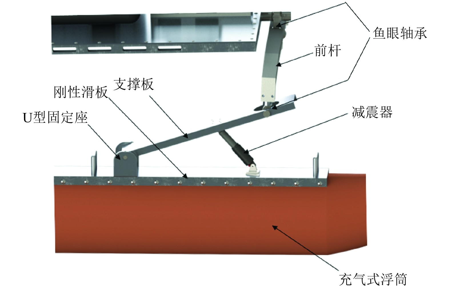 波浪适应双体船的悬挂系统的设计思路主要来源于汽车的悬架系统,具体结构如图4所示。其位于左右浮筒上,与前杆和刚性滑板连接,能够衰减和缓冲波浪作用于浮筒上的激励,同时将推进系统产生的推进力和转向力矩传递到前杆上,保证无人船的正常航行。当无人船在海面上行驶时,波浪对浮筒造成的垂向位移会被减震器衰减和缓冲,使得振动的幅值减小,频率增大,从而确保无人船在波浪中行驶过程中载荷平台能够处于稳定状态。