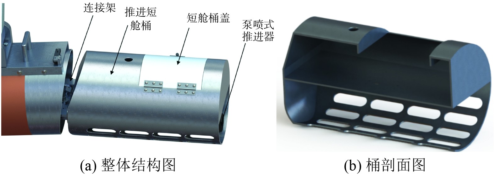 推进系统作为船舶的核心动力装置,本文经比较后选定低噪音、低震动且低成本的电力推进系统。结构设计如图5所示,推进短舱铰接在浮筒的尾部,允许其沿着浮筒的横轴进行旋转以适应船体姿态变化,其中推进短舱桶内部有一层用于安装固定泵喷式推进器的隔板,通过隔板分层设计实现推进器模块化维护。在推进器的选型方面,为确保无人船的稳定行驶,使推进器具备可调节的推力,以适应波浪变化和无人船的运动需求,本设计采用泵喷式推进器作为推进装置。