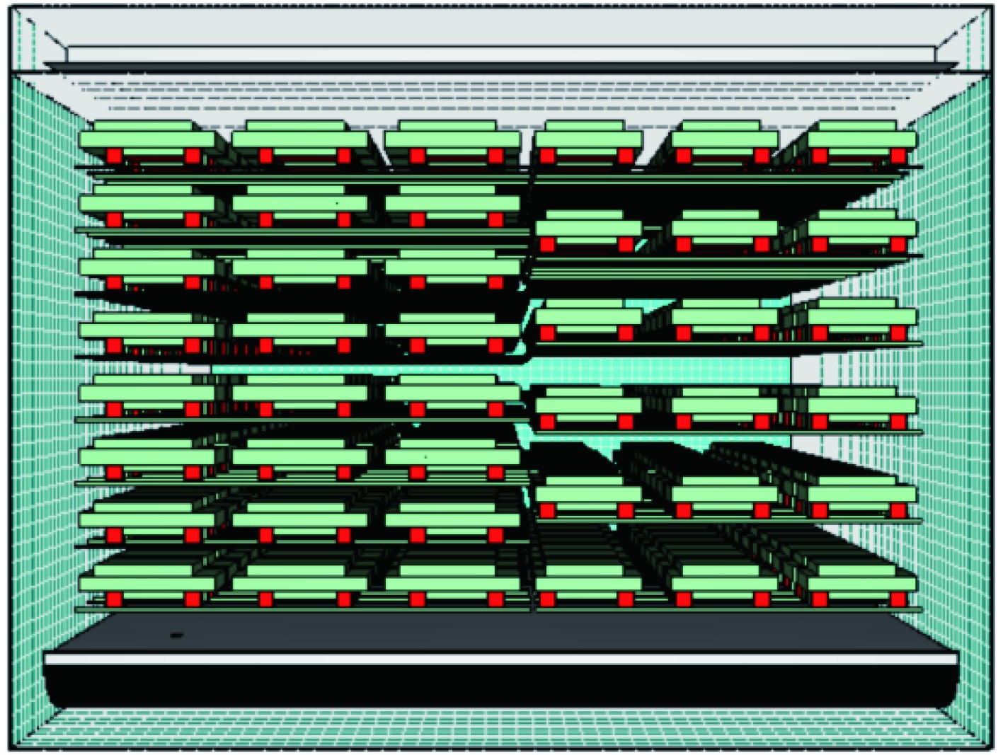 简化后的货舱物理模型如图1所示,为了方便观察火源和烟气蔓延情况,对外侧舱壁进行了隐藏处理。尽管模型对货舱内的复杂结构进行了简化,但通过保留锂电池包和轮胎这2个主要火源,模型能够准确反映火灾蔓延的关键特征。锂电池包和轮胎的热释放速率、燃烧特性以及火灾蔓延路径是火灾模拟的核心要素,简化后的模型在保证计算效率的同时,能够有效捕捉火灾蔓延的主要趋势。此外,模型的边界条件设定为开放边界,进一步确保了模拟结果的可靠性,能够真实反映火灾在货舱内的动态发展过程。
