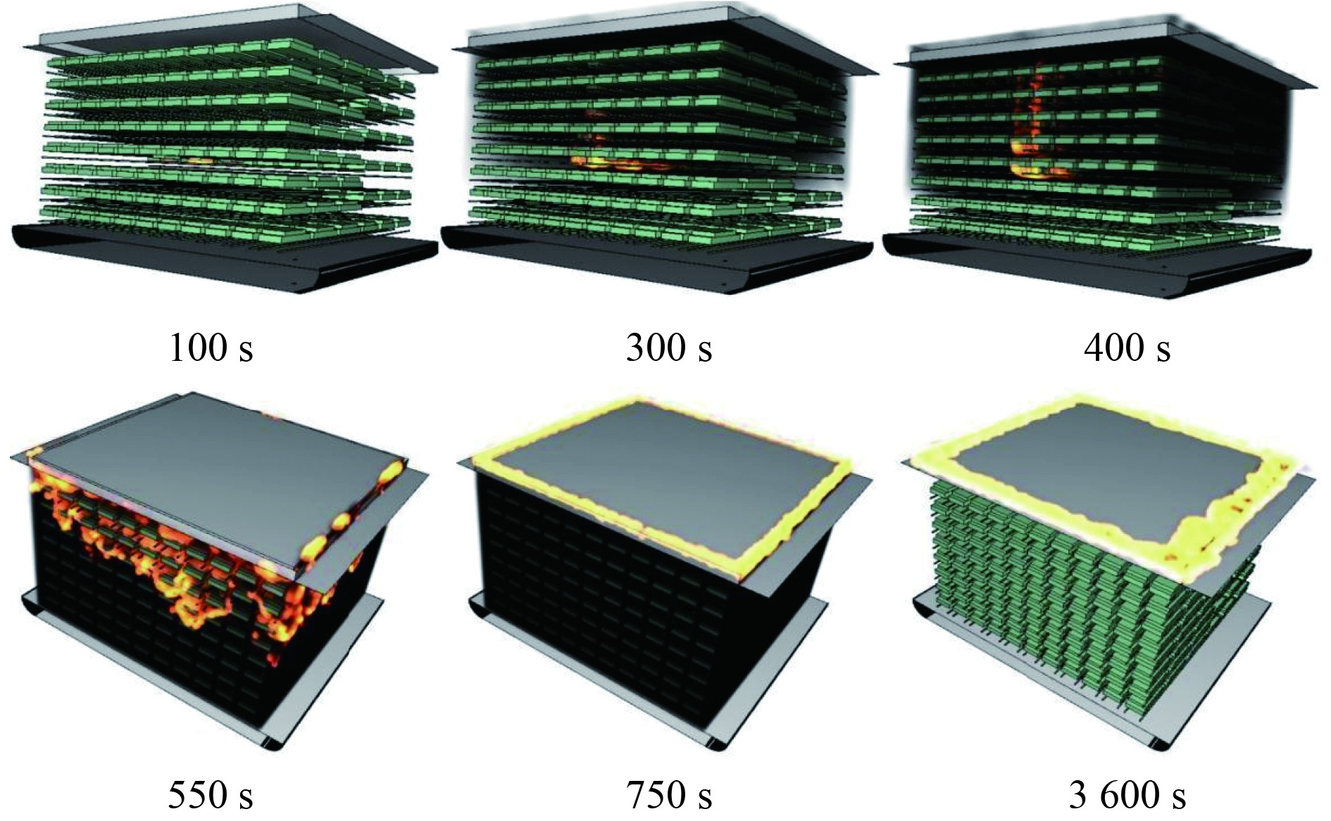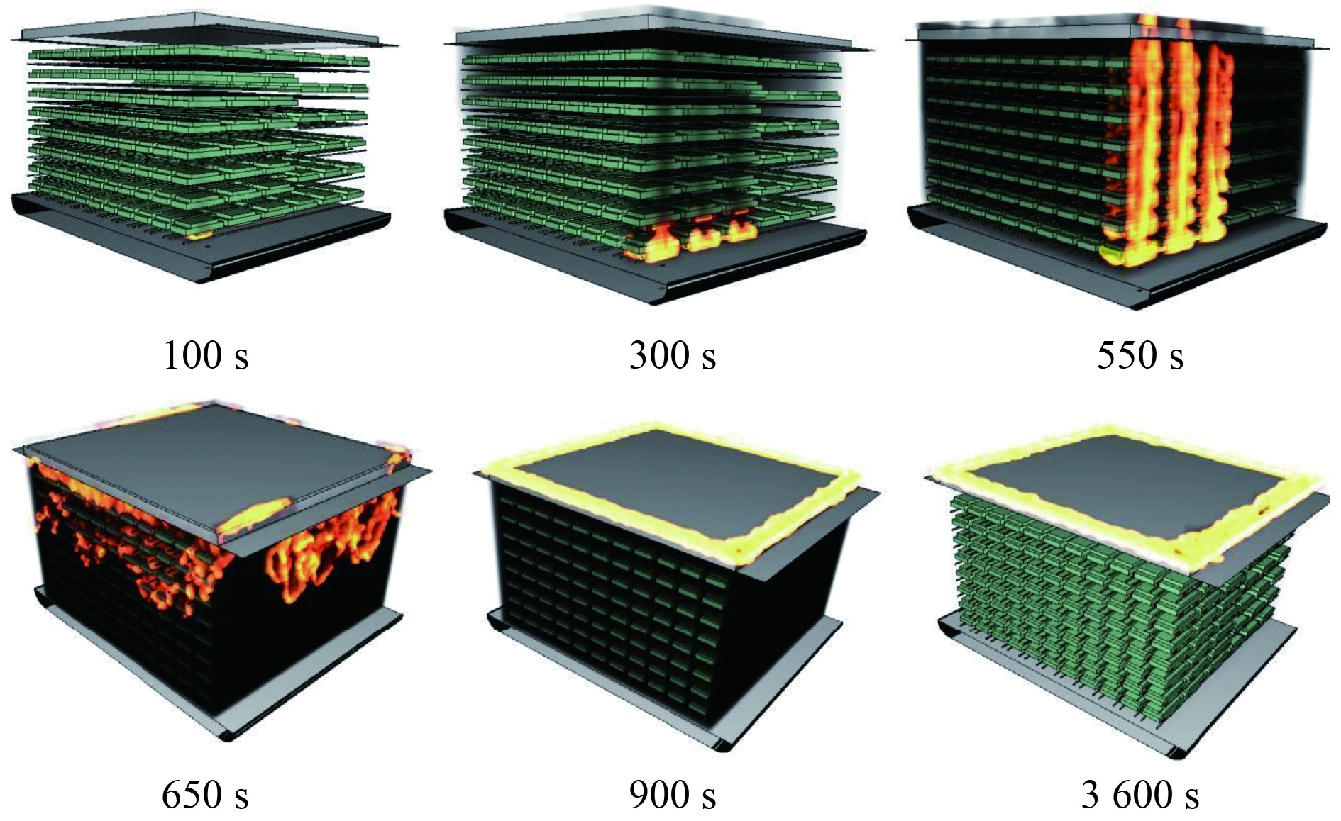 研究发现,新能源车辆动力电池起火是引发运输船火灾的主要因素[1]。近年来,锂电池火灾的仿真模拟研究已成为安全领域的热点课题。Lyu等[2]系统分析了锂电池在宽温度范围内的热失控触发机制,而Duh等[3]则重点研究了新能源汽车中商用