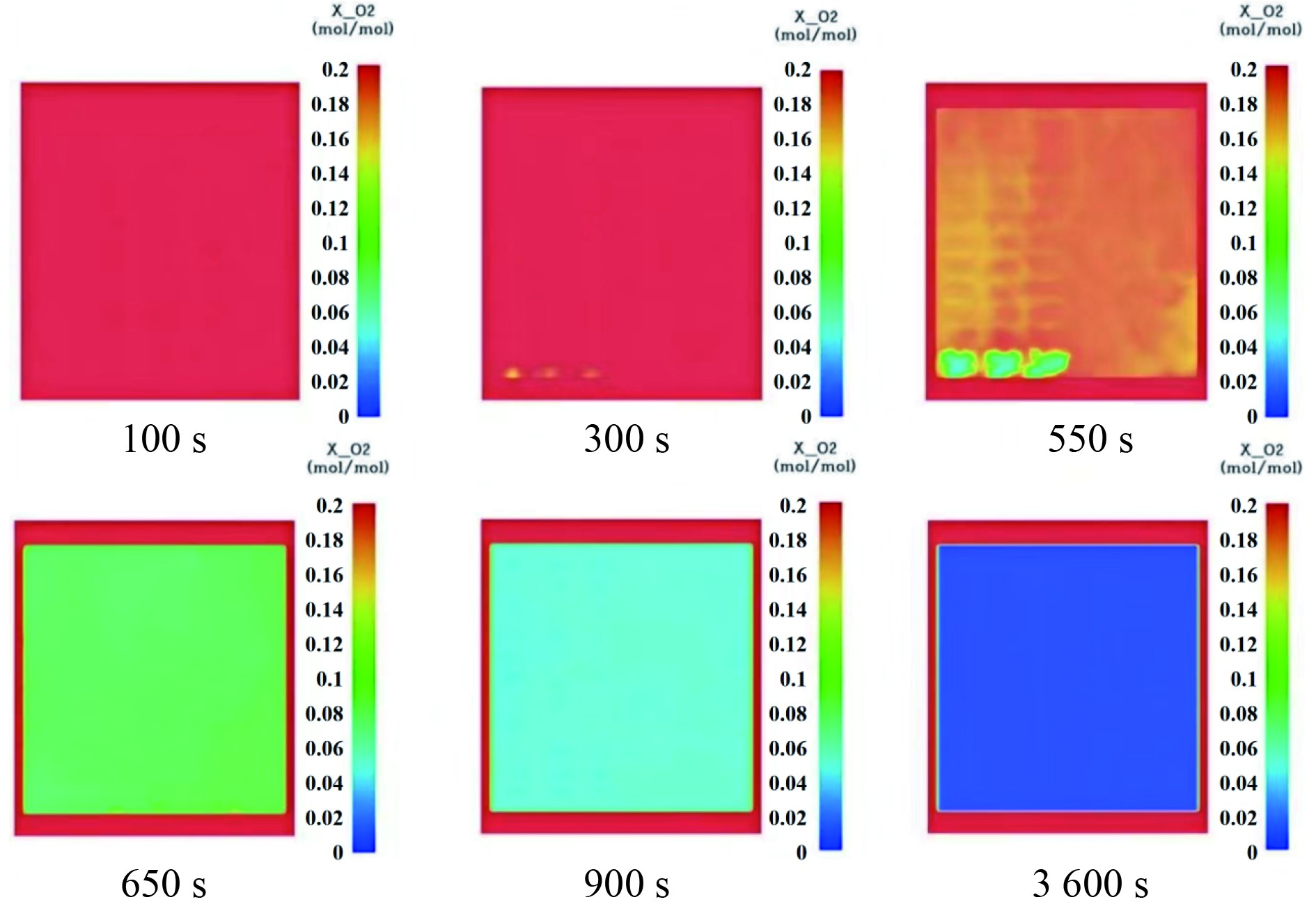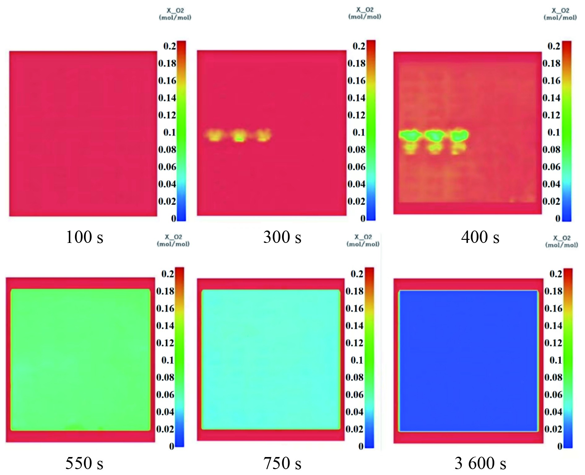 图8和图9分别为货舱中央区域一辆锂电池新能源车发生热失控后1 h内货舱中的烟气与燃烧蔓延情况和10 m高度处的氧气体积分数变化情况,设置其发生热失控的时间为0 s。在100 s时,货舱中央区域一辆锂电池新能源车电池包刚刚起火,烟气蔓延并不明显,氧气体积分数在10 m高度处基本无变化;到了300 s时,货舱中央位置处的折叠框架内3辆锂电池新能源车也开始剧烈燃烧,此时货舱内的烟气浓度也不断增加,氧气体积分数在中央位置处有略微下降;燃烧向上迅速蔓延;到了400 s,该折叠框架正上方位置处的所有新能源车都发生了热失控并剧烈燃烧,燃烧继续向上蔓延,同时烟气已经蔓延至货舱内大部分区域,氧气体积分数在货舱中央位置处下降到了0.1左右,而此高度整体浓度在0.18左右;550 s后,燃烧继续扩大并蔓延,整个货舱内的新能源车基本上都在剧烈燃烧,烟气笼罩了整个货舱,氧气体积分数下降到了0.07左右;在750 s时,烟雾浓度过高的同时氧气体积分数也下降到0.04左右,导致窒息火现象出现,货舱内的燃烧反应基本已经结束;随后,货舱内不再产生烟气,烟气逐渐散去,浓度减小,直至