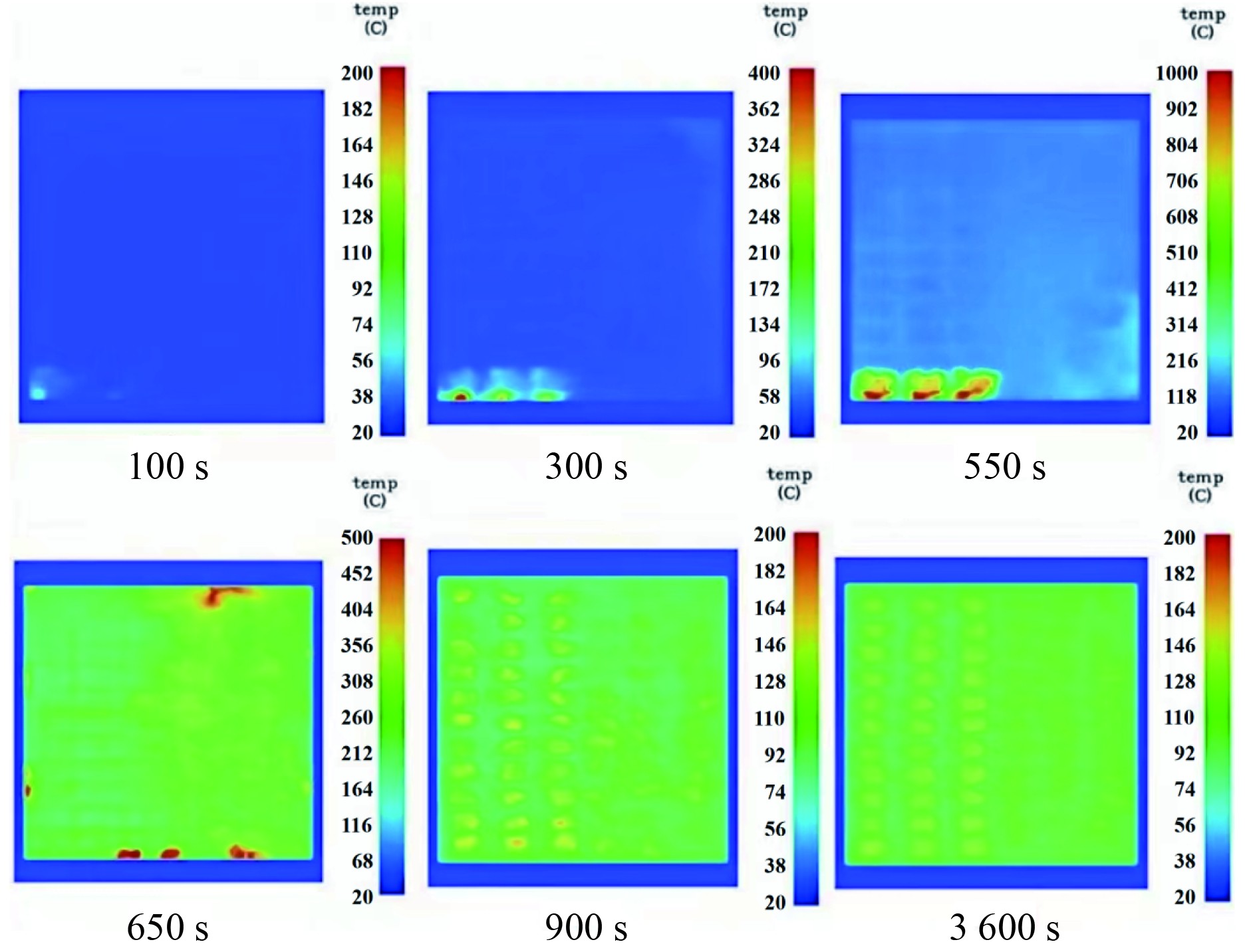 图10为货舱中央位置处一辆新能源车发生热失控时整个货舱在10 m高度处的水平温度切片,图11为该高度测点温度变化曲线图,最初发生热失控的锂电池新能源车在货舱的9 m高度处。在100 s时,热失控的燃烧反应还处在初始阶段,温度无明显变化;在100~300 s期间,货舱中央位置处的温度持续上升,300 s时达到了500℃左右,为该平面的最高温度;在300~400 s期间,温度继续上升,燃烧迅速蔓延至货舱中央位置处上方的所有锂电池新能源车,400 s时中央位置的温度上升至约