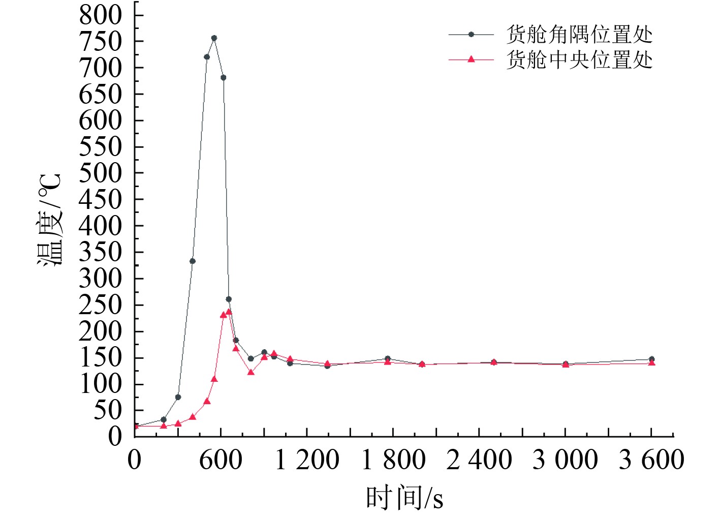 图12为货舱中央位置处新能源车发生热失控时的热释放速率变化情况。从图中可以观察到,在530 s左右时,整个货舱内的新能源车基本上都在剧烈燃烧,热释放速率达到了第一个峰值,约为300 MW;之后在530~700 s之间,货舱内氧气逐渐散去,形成窒息火,此时货舱内的燃烧反应基本已经结束,热释放速率也随之下降,最低点达到了30 MW;700 s之后,燃烧开始向舱口盖周围蔓延,热释放速率开始持续上升,直至