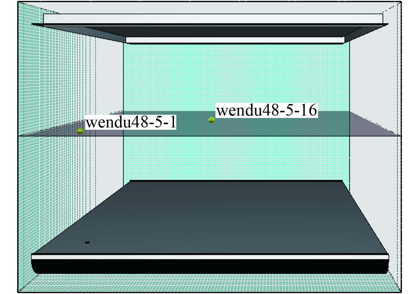 火灾场景具有描绘火灾全过程不断变化的能力,应根据最不利原则在设计火灾场景时考虑可能导致最严重和危害性最大后果的情况。火灾场景设计的合理性直接影响舱室防火功能的可靠性和主要设备的损伤程度。在货舱角隅位置处,由于角落比较隐蔽且通风不良,一旦发生热失控导致锂电池起火,燃烧很容易蔓延并且很难及时被发现;在货舱中央位置处,周围锂电池数量较多,发生热失控引发火灾的可能性较大,一旦火灾发生,燃烧的锂电池会相互影响、加剧燃烧蔓延,加重火灾的危险性。因此,选择这两种火灾场景可以突出锂电池新能源车货舱内部存在的潜在火灾风险,以便对应急预案和救援方案进行充分准备和演练。