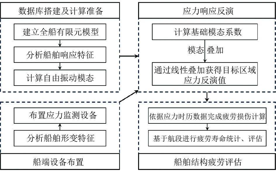 1 基于应力反演的疲劳评估技术疲劳评估技术的计算主要分为4个部分:搭建全船有限元模型,利用有限元计算软件获取船舶不同振型的自由振动基础模态,依据船舶形变特征选择提取基础模态应力矩阵;根据船舶的结构特点,在船舶结构处设置少量应力应变监测设备,以反映船舶在波浪载荷下的响应特征;基于模态叠加方法,由监测设备应力数据,计算各基础模态的权重系数,并依据权重系数对基础模态进行线性叠加,反演得到目标区域的应力响应;采用反演得到的应力时域数据计算评估目标区域的疲劳损伤。