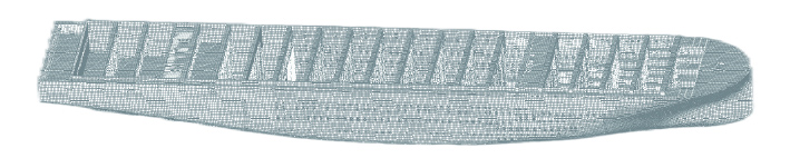 本研究对象为一艘14000TEU集装箱船,船长330 m,全尺寸有限元模型如图4所示。与变截面梁模型相比,该模型能更准确地模拟船舶在波浪载荷下的振动模式和响应。