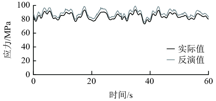 同样基于应力反演技术对W1处应力响应进行反演,并选取该海况下应力波动较为剧烈的60 s进行应力时历数据分析,W1处实测应力与反演应力时历曲线如图8所示。