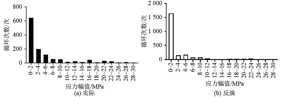 可知,反演应力在小幅度应力波动方面的循环频次显著增加,而大幅度应力波动的循环次数与实测值差异较小。这表明,反演方法在较小波动范围内的应力变化被放大,而对大幅度波动的影响相对较小。