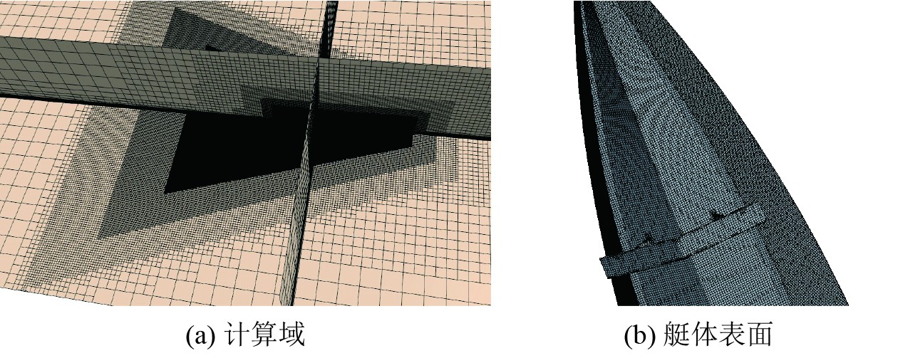 网格离散采用切割体与棱柱层网格相结合的形式,并采用重叠网格技术,在艇体附近设置重叠网格区域。为更好地捕捉自由表面处与流场,在相关位置采用六面体密度盒进行局部加密。在距离艇体较远的区域,网格尺寸逐渐放大,以此减小网格数量,达到节省计算时间的效果。计算域整体以及艇体表面的网格划分网格情况如图3所示。