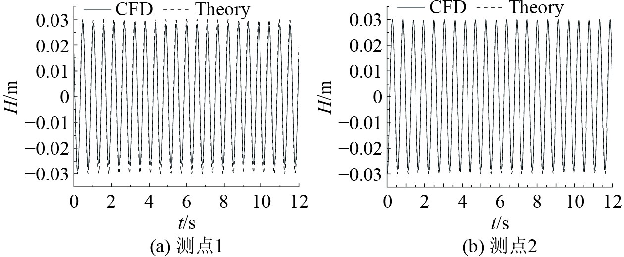 为验证数值造波的精度,对规则波进行数值模拟,并将计算结果与理论值进行对比。以波高H=0.06 m、