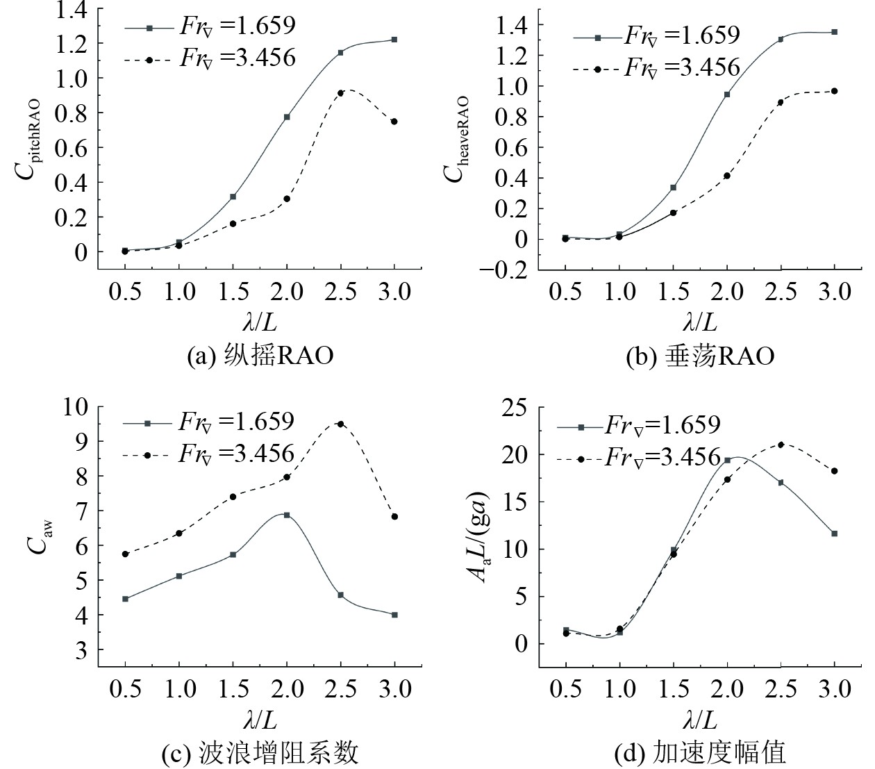 1)水翼艇垂荡的幅值响应在不同速度下呈现先增大而后趋于稳定的趋势;纵摇与垂荡的幅值响应均随着航速的增加而减小;不同航速下,波浪增阻系数均随着波长的增加先增大后减小;在