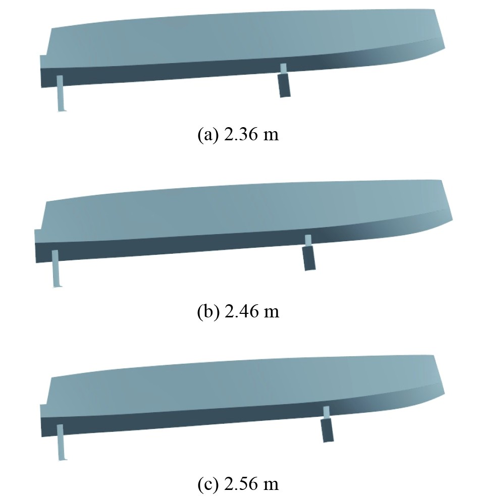 通过调整首部水翼位置,设计出3种不同水翼安装方案,首尾水翼的距离分别设置为2.36、2.46、2.56 m,如图7所示。