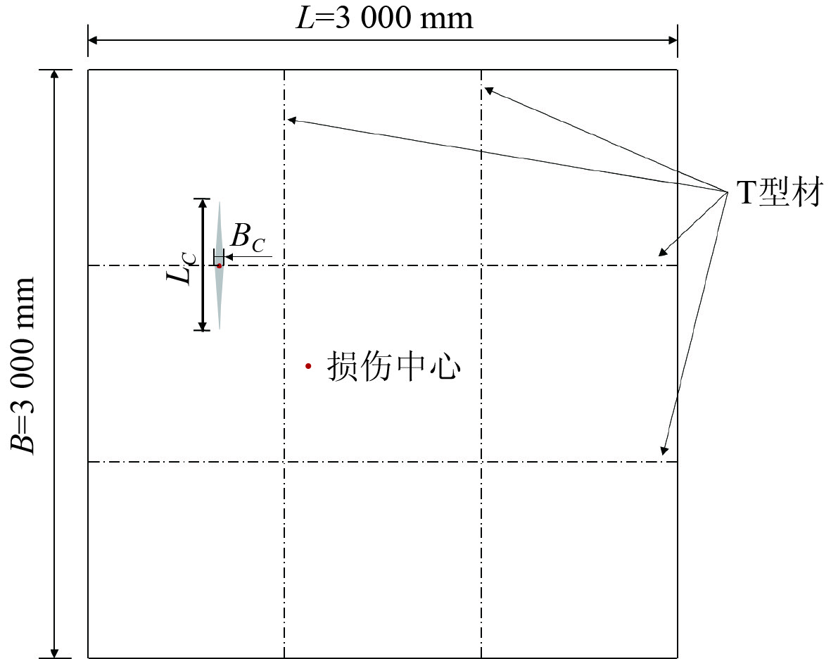 从工程实际上看,船上裂纹多出现在加筋板根部的应力集中区[9],裂纹会在焊缝缺陷处始发,然后在环境载荷的作用下进一步延伸,造成舱室进水[10]。因此本文考虑裂纹中心只出现在T型材加强筋根部的情况,不同位置出现裂纹的概率相同。损伤形状设置为菱形,裂纹长度
