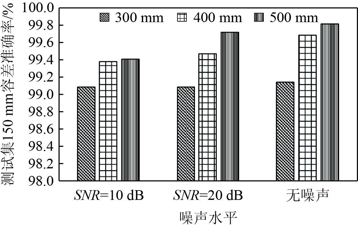 表2~表4分别为无噪声、SNR = 20 dB、SNR = 10 dB条件下,采用CNN-LSTM方法对不同长度裂纹进行损伤定位的统计结果,距离误差按照结构尺寸的2%(60 mm)和5%(150 mm)设置3个等级,统计各等级内的样本数目。测试集中所有样本的最大距离误差不超过200 mm,99%的样本的距离误差不超过150 mm,因此通过对裂纹中心进行坐标定位的方式实现损伤位置检测是可行的,检测效果良好,与实际损伤位置的偏差不超过5%结构尺寸。