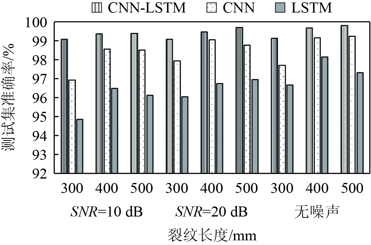 3.3 不同方法对比分别采用CNN-LSTM、CNN和LSTM三种方法在SNR = 10 dB、SNR = 20 dB和无噪声情况下进行损伤位置检测,图11和图12分别为测试集平均误差和容差为150 mm时的准确率对比。在无噪声情况下,CNN-LSTM方法的测试集准确率为99.81%,高于CNN方法99.24%的和LSTM方法的97.33%。在有噪声情况下,3种方法的损伤定位精度均有所降低,但CNN-LSTM方法仍保持99%以上,CNN方法和LSTM方法分别降低为96.92%和94.86%。3种方法平均误差的差距更为明显,以裂纹长度300 mm、SNR = 10 dB为例,CNN方法和LSTM方法的测试集平均误差分别为72.44 mm和61.25 mm,约为CNN-LSTM方法的1.5~2倍。CNN-LSTM方法具有更好的裂纹中心定位精度,而且对噪声的敏感程度远低于CNN和LSTM方法。