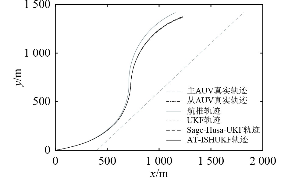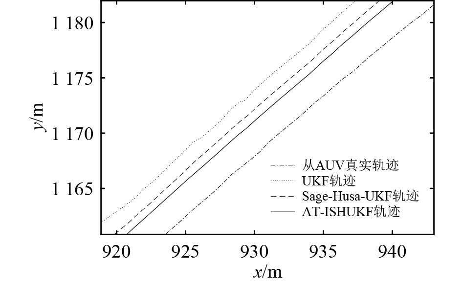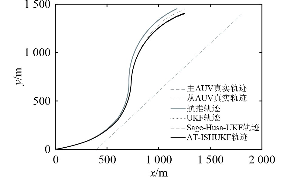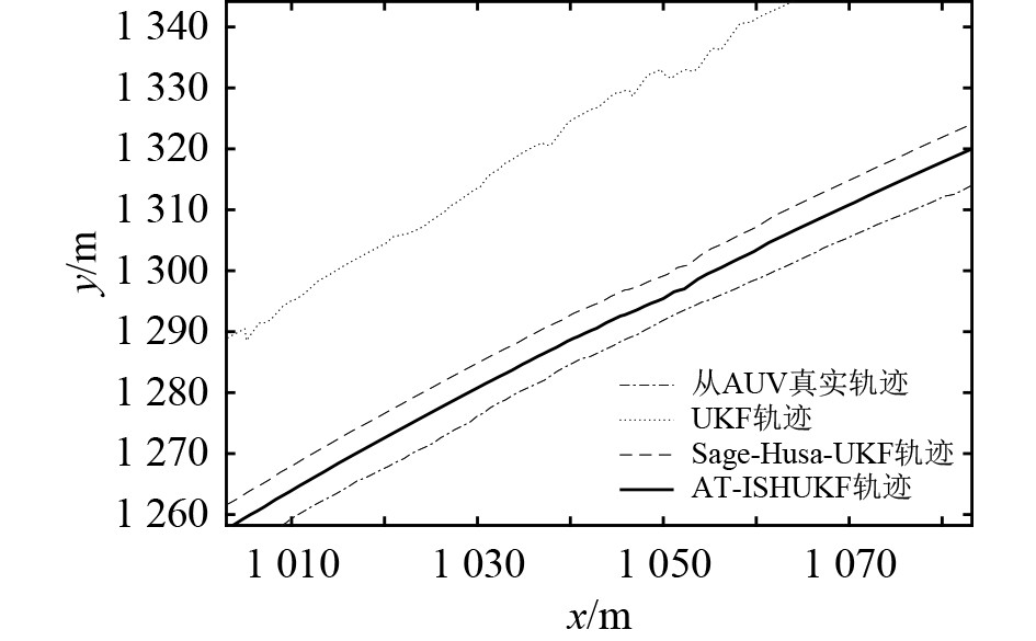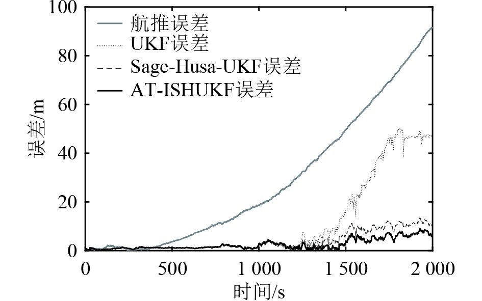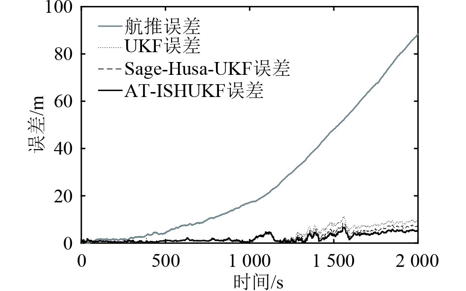 由表2可知,在噪声统计特性未突变时,3种算法在航行初期的性能差异不大。由表3可知,在过程噪声统计特性突变时,3种算法的定位精度均下降,其中UKF算法的定位精度下降最大,Sage-Husa-UKF算法其次,AT-ISHUKF算法最小。由表4可知,在过程噪声和观测噪声的统计特性先后突变时,UKF算法的定位精度发散,AT-ISHUKF算法和Sage-Husa-UKF算法定位精度均下降,但AT-ISHUKF算法比Sage-Husa-UKF算法的定位精度更高,说明在过程噪声和观测噪声的统计特性先后突变时,AT-ISHUKF算法的性能优于Sage-Husa-UKF算法。由表5可知,在噪声统计特性突变情况下,此时UKF算法发散,AT-ISHUKF算法的平均定位误差比Sage-Husa-UKF算法减少了48.9%,均方根误差减少了61.7%。由此可知,在这种情况下,AT-ISHUKF算法相较于其他2种算法同样具有更加精确的定位精度和更加优良的鲁棒性。