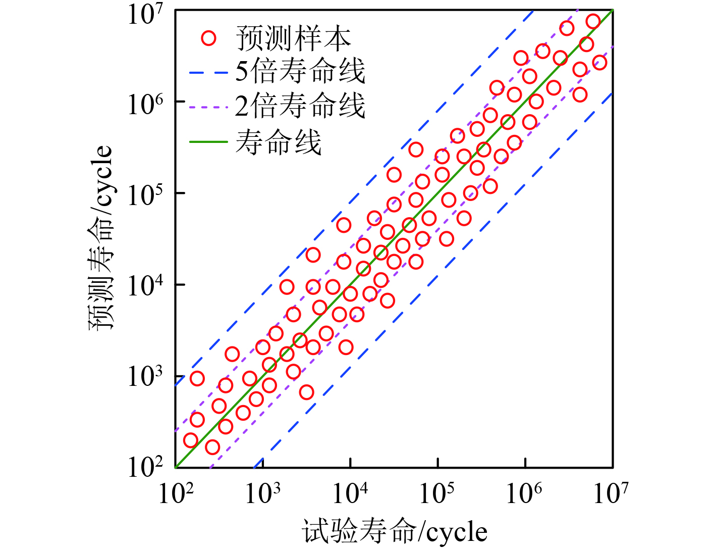 可知,针对选取的试验船用风机运行过程中若干样本,实现预测的寿命分布均处于试验寿命的5倍寿命线内,有效证明了本文方法实现船舶机舱风机动态振动疲劳寿命预测的准确性。这是因为所提方法通过功率谱密度矩法精确量化了非平稳载荷特征,结合改进累积损伤模型和跨尺度裂纹演化理论,系统性降低了传统方法在动态振动工况下的建模误差。