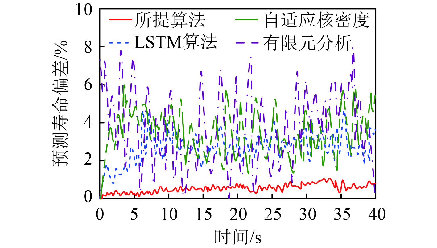 通过所提算法进行船舶机舱风机动态振动疲劳寿命预测,对预测寿命偏差情况进行统计,将所提算法实现的船舶机舱风机动态振动疲劳寿命预测偏差与疲劳寿命预测中常用的自适应核密度算法、有限元分析模型算法、长短期记忆网络(LSTM)模型算法实现的预测偏差进行对比,得到的结果如图2所示。