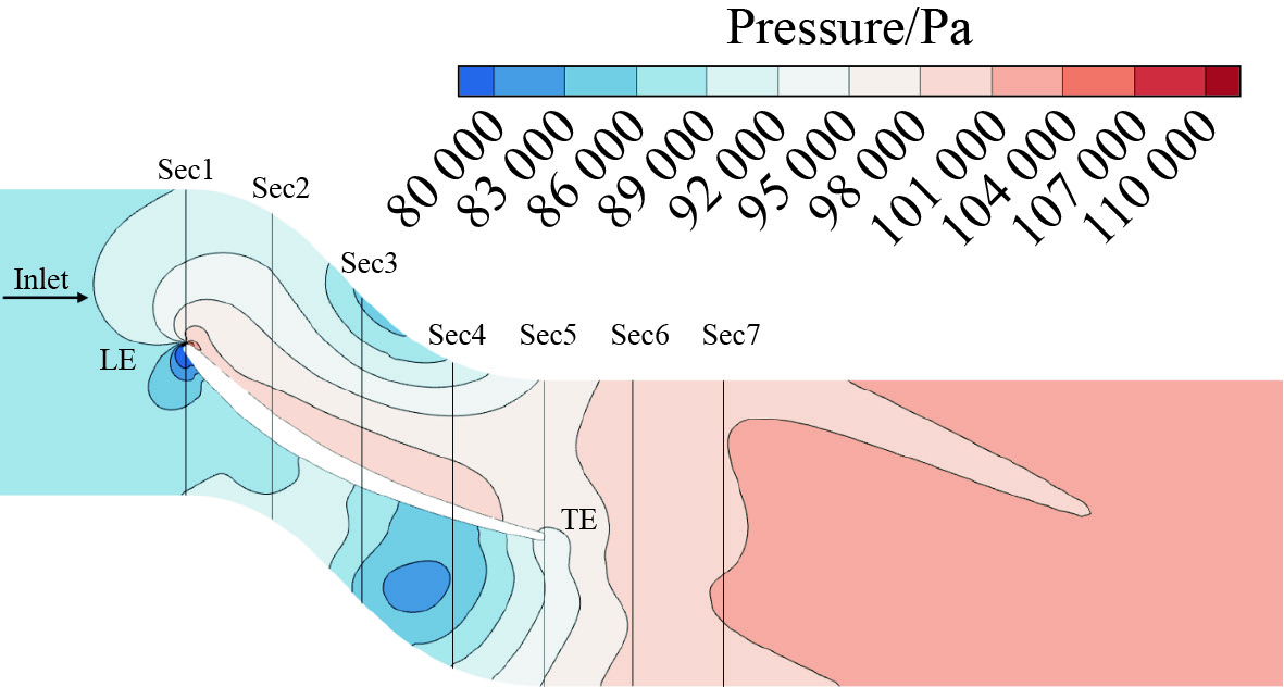 近些年随着舰用燃气轮机整机性能的不断发展,在保证足够稳定裕度的同时提高压气机级压比一直是众多研究学者追求的重要目标[1,2]。有关研究表明,高负荷扩压叶栅内部存在较大的横向逆压梯度导致端壁和吸力面极易发生角区分离[3 − 5],高轴向逆压梯度也影响低能流体的顺利流出,使得低能流体大量堆积,导致间隙泄露流和端区二次流的增加,叶栅流动损失加剧[6,7]。由于压气机实际运行过程中并不是一直处于设计工况,作为极易诱导不稳定变动参数之一的冲角会对叶栅气动性能产生一定影响。在极端冲角工况下,叶栅内分离加剧流动进一步恶化,甚至可能诱发失速和堵塞喘振现象[8 − 10],影响压气机的稳定工作。因此,探索变冲角对高负荷叶栅流动状态的影响对优化叶栅变工况条件下稳定运行性能具有非常重要的意义。