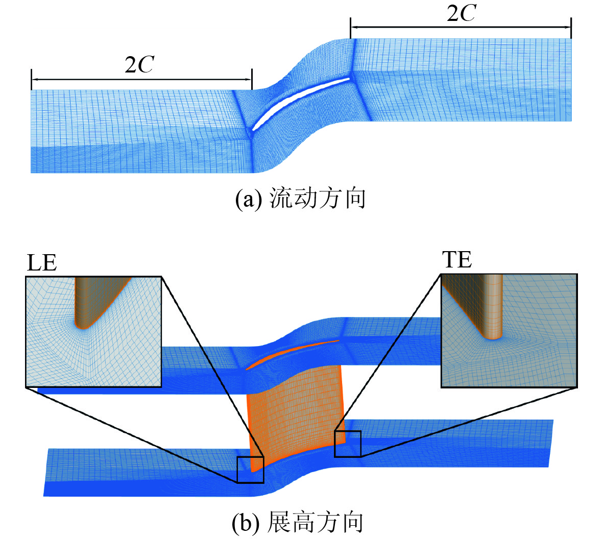 为了更好探究变冲角对叶栅气动性能的影响,在权衡网格质量和计算资源2个因素的基础上,选取单叶片半叶高进行计算,网格数量约为131万。图2为高负荷扩压叶栅计算域网格示意图,为了使计算更好捕捉叶栅通道内的流动状态,使用Ansys ICEM对流场流域采用“H-O4H-H”划分策略生成六面体结构化网格,并在计算域三维方向上布置足够的网格节点。同时,对叶栅前尾缘及近壁面的网格进行加密处理,通过计算得到合适的壁面平均y+值为0.103,小于1,满足所选湍流模型(SST)的要求。稳态流动计算使用Ansys FLUENT 2021R2,选用耦合γ-θ转捩模型的shear stress transport(SST)模型封闭方程组。计算域进口处距离叶片前缘2C,计算域出口距离叶片尾缘2C。在叶栅通道两侧。本研究采用了平移周期性边界条件的设定,叶片表面及下端壁面设置为光滑绝热壁面,上端壁设置为对称边界条件。计算域进口给定总压、总温和湍流度,变冲角时调整进口总压使得进口马赫数保持0.66不变,出口给定静压为大气压(