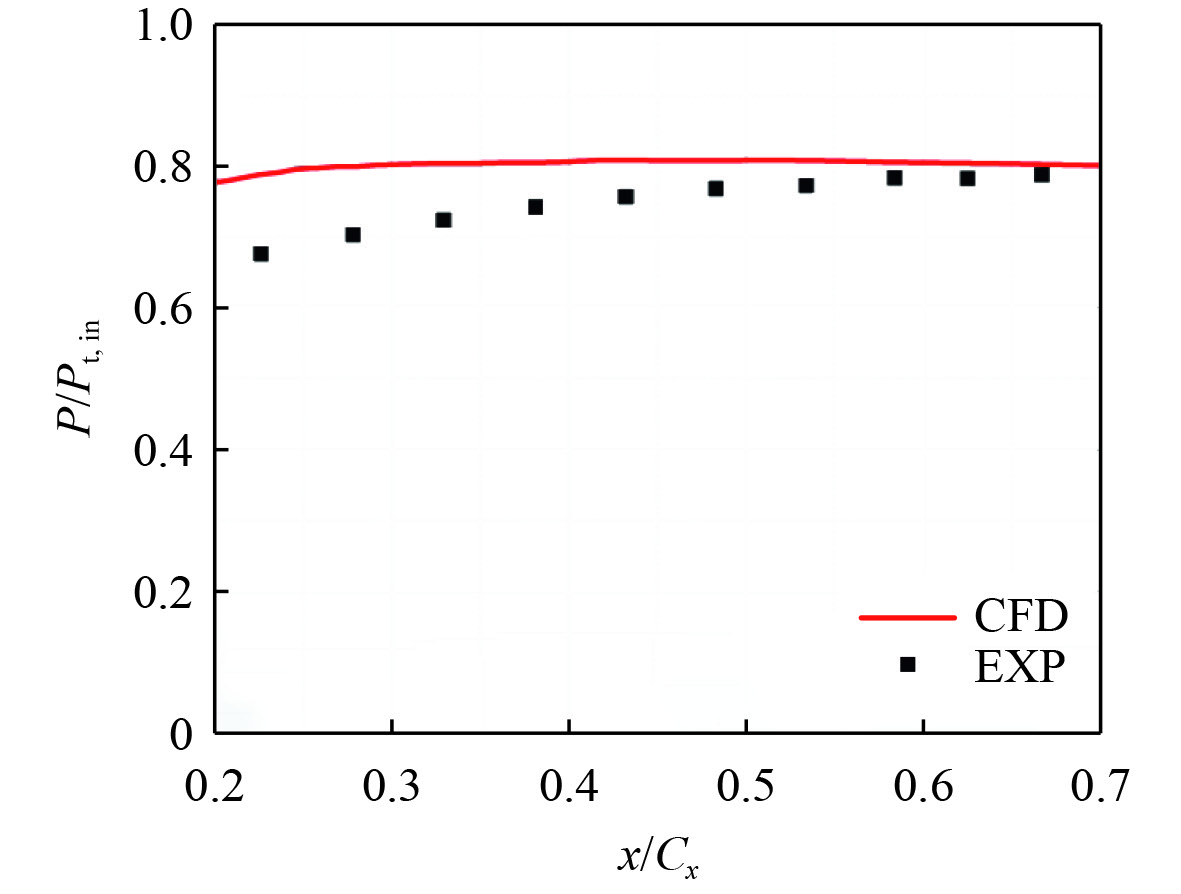 图 3 表面压力与进口总压之比的轴向分布对比 Fig. 3 Comparison of the axial distribution of the ratio of surface pressure to total inlet pressure |