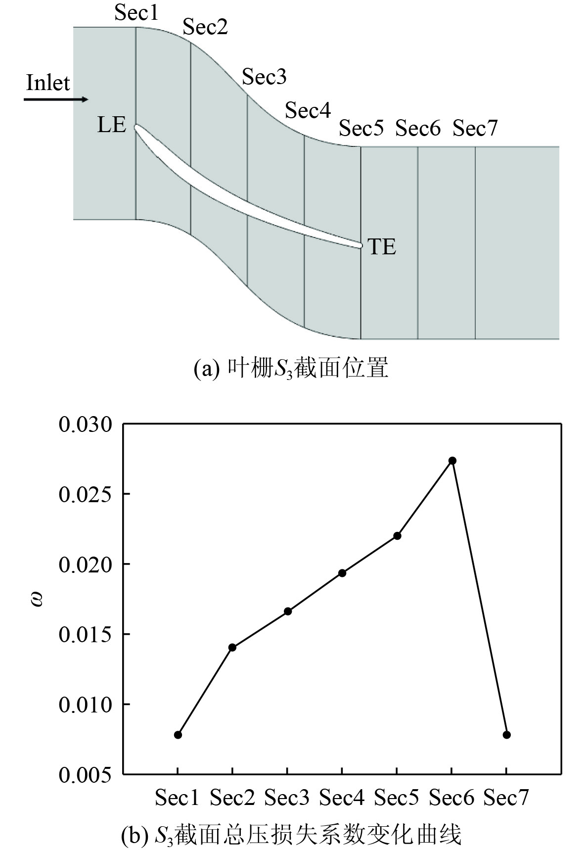图 4 叶栅S3截面位置及各S3截面总压损失系数变化曲线 Fig. 4 The position of the S3 section of the cascade and the variation curve of the total pressure loss coefficient of each S3 section |
