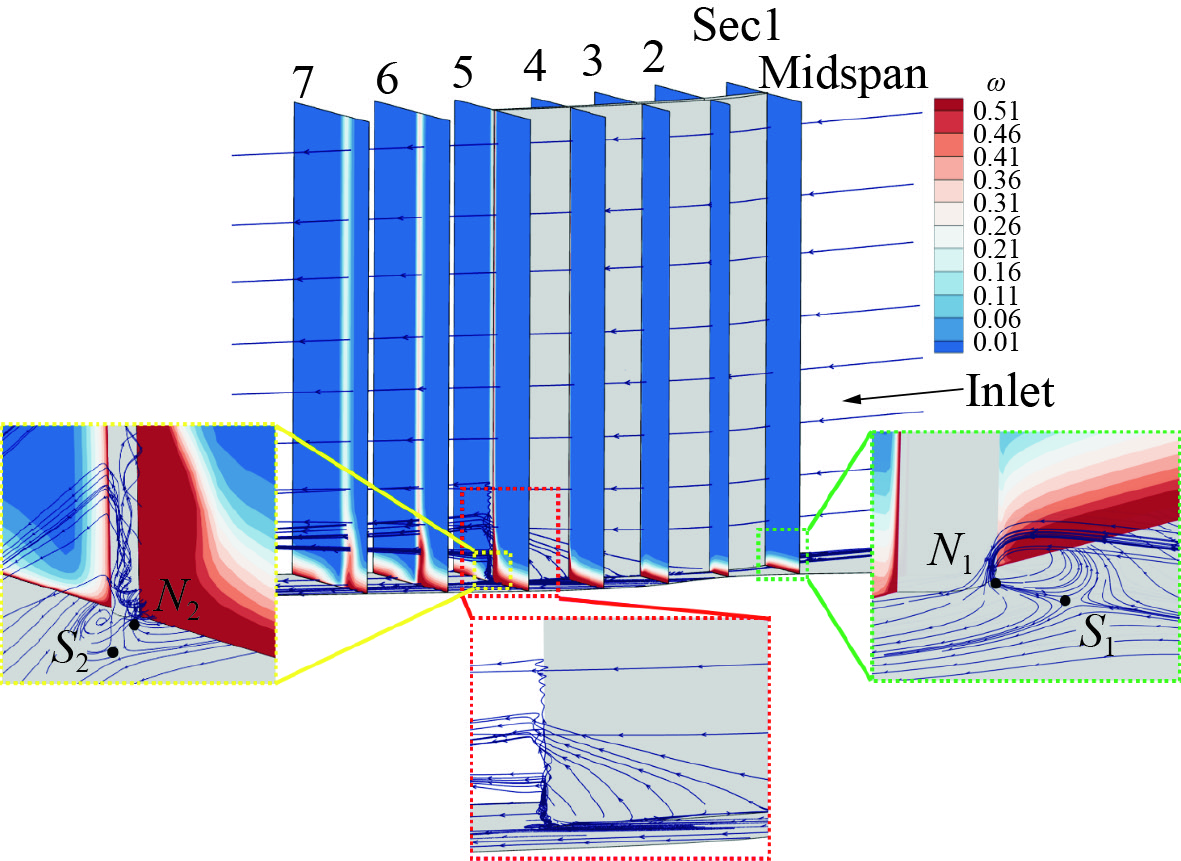 叶根三维角区范围内低能流体团的堆积发展及通道内部复杂涡系的相互作用直接影响了压气机叶栅内的流动损失。为进一步探究各截面流动损失的发展成因,图5给出了叶栅S3截面总压损失系数分布及体流线图。可知,展向叶中处受到端壁粘性作用及二次流动影响最小,整个叶栅流道内叶型损失所占比例较小。从Sec1~Sec5截面,高损失范围在流向及展向上呈现出增大趋势,同时角区损失逐渐发展为总损失的主要表现形式,这是由于叶栅通道内轴向压力梯度的存在导致端壁附面层附近的低能流体发生分离并在叶栅吸力面和端壁之间的三维角区内大量堆积。进一步观察叶片吸力面近壁面区域体流线,由于来流附面层与端壁之间存在粘性作用,附面层范围的流体速度较低。同时受压力面与吸力面间的压差作用,横向二次流产生,大量低能流体在角区大量堆积。此外,由于受到轴向逆压梯度的影响,低能流体在抵达角区分离位置后,开始顺着吸力面及端壁分离线向前延伸发展。分别对叶片前后缘近端区区域放大,可以发现在前缘近端区,高速气流最先到达叶片前缘,之后流向端壁,在接触到端壁后分成2组后继续向四周扩散,并在端壁-前缘区域出现奇点