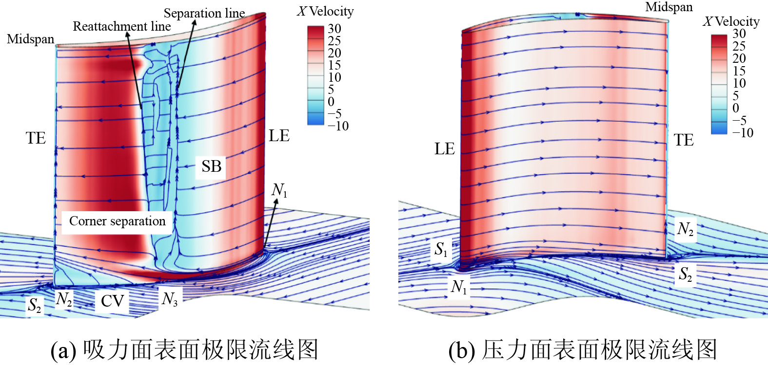 图 6 叶片表面及端壁极限流线图 Fig. 6 Limiting streamline on blade surface and endwall |