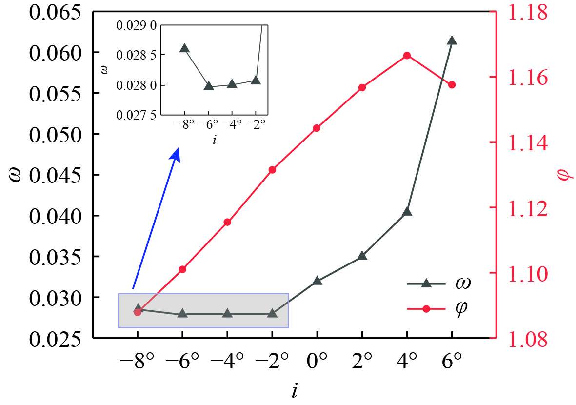 图 7 叶栅总压损失系数和静压比随冲角的变化曲线 Fig. 7 Variation curves of the total pressure loss coefficient and static pressure ratio of the cascade with the angle of attack |
