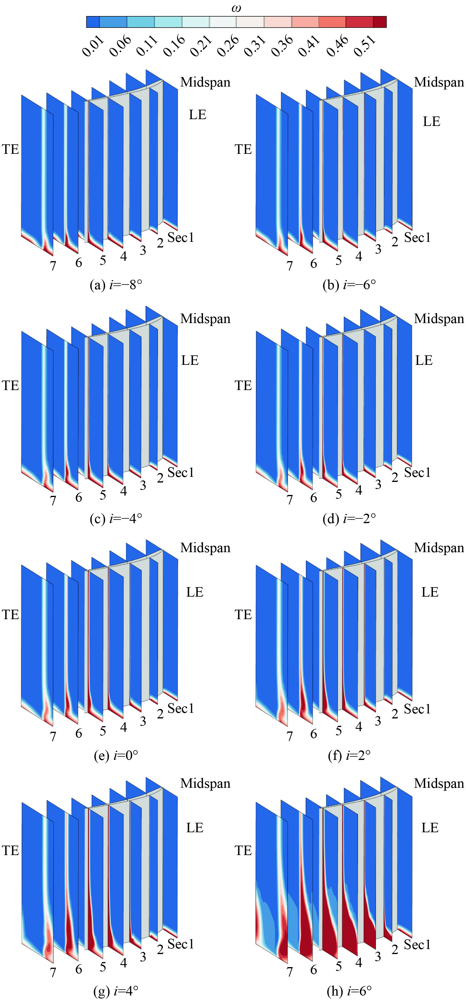 来流冲角的改变必然导致流动结构发生变化,进而对叶栅通道内流动损失的发展造成一定波动。观察图8所呈现的S3截面总压损失系数云图,可清晰看出,不同冲角条件下,通道内总压损失发展趋势表现出一致性。当来流为负冲角(−8°~−2°)时,由于受端壁-吸力面侧低能流体团的影响,高损区主要位于吸力面角区附近,随着气流在叶栅通道内的运动,高损失范围沿着展向及横向变大。中径附近因端壁粘性及二次流较小波及而呈现为低损失区域。随着来流冲角的继续增大,特别是正冲角时,叶栅通道内二次流流动加剧,角区分离进一步恶化,复杂涡系结构剧烈掺混导致其裹挟的低能流体沿展向不断抬升并运动到中径附近,导致角区分离提前发生,分离范围迅速扩大并逐渐恶化。当来流冲角为+6°时,在靠近叶片前缘位置即开始发生流动分离,角区分离的高损区在近乎全流道内覆盖至1/4叶高范围,表现为强烈的角区失速。