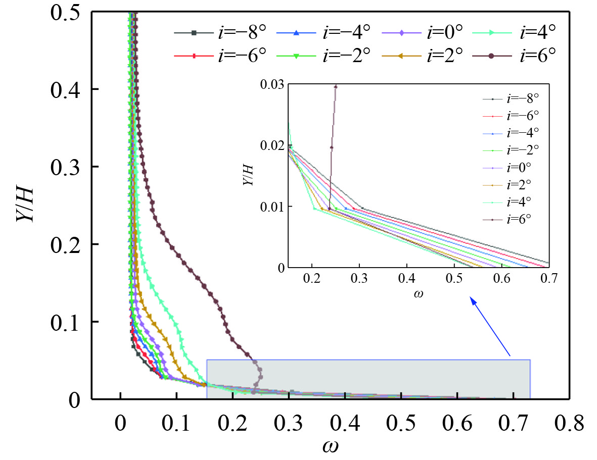 此外,为进一步量化各冲角下总压损失系数径向上的发展趋势,图9给出了Sec7截面位置总压损失系数经节距平均后随叶高的变化规律,其中纵坐标Y/H对叶高进行了无量纲化处理。如图9所示,与叶栅S3截面总压损失系数云图相一致,叶栅损失由叶型损失、端壁附面层损失和二次流损失组成。叶中展向处所对应的叶型损失处于较低水平,由于流体具有粘性,在近端壁区域存在较大的端壁附面层损失。但随着来流冲角的不断增大,叶栅通道内二次流加剧恶化,角区分离与主流之间的相互作用使得二次流损失影响程度及作用范围呈现增大趋势,相较于−6°冲角下二次流损失范围(0.03<Y/H<0.08),+6°冲角下二次流损失范围扩大为0.01<Y/H<0.35。