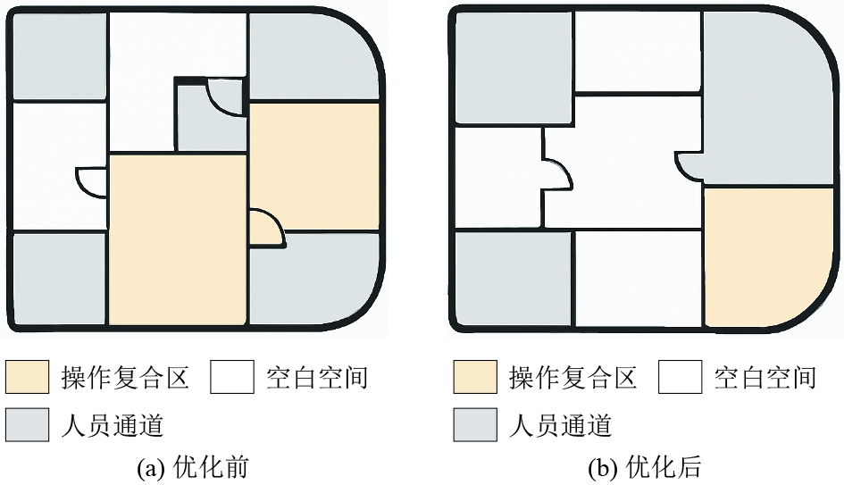 采用检修流程时间、RULA(Rapid Upper Limb Assessment,快速上肢评估)评分以及空间利用率等指标来评价优化前后舱内布局的情况如图1所示。图1(a)为优化前的舱室布局,图片中黄色区域对应设备与操作复合区,灰色区域对应人员通道区,白色区域为舱内空白空间(含无效间隙与边角)。从布局可见,黄色的设备与操作复合区划分零散且形状不规则,存在多处弧形边角,与灰色通道区边界交错,导致大量白色空白空间无法利用;同时灰色通道存在迂回段,需绕行黄色区域内的设备,虚拟人员完成一次检修流程耗时约185 s,RULA评分为5.2,空间利用率目标值仅0.62,且因设备间距未满足电磁兼容要求,约束满足度仅65%。