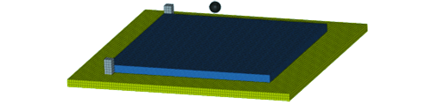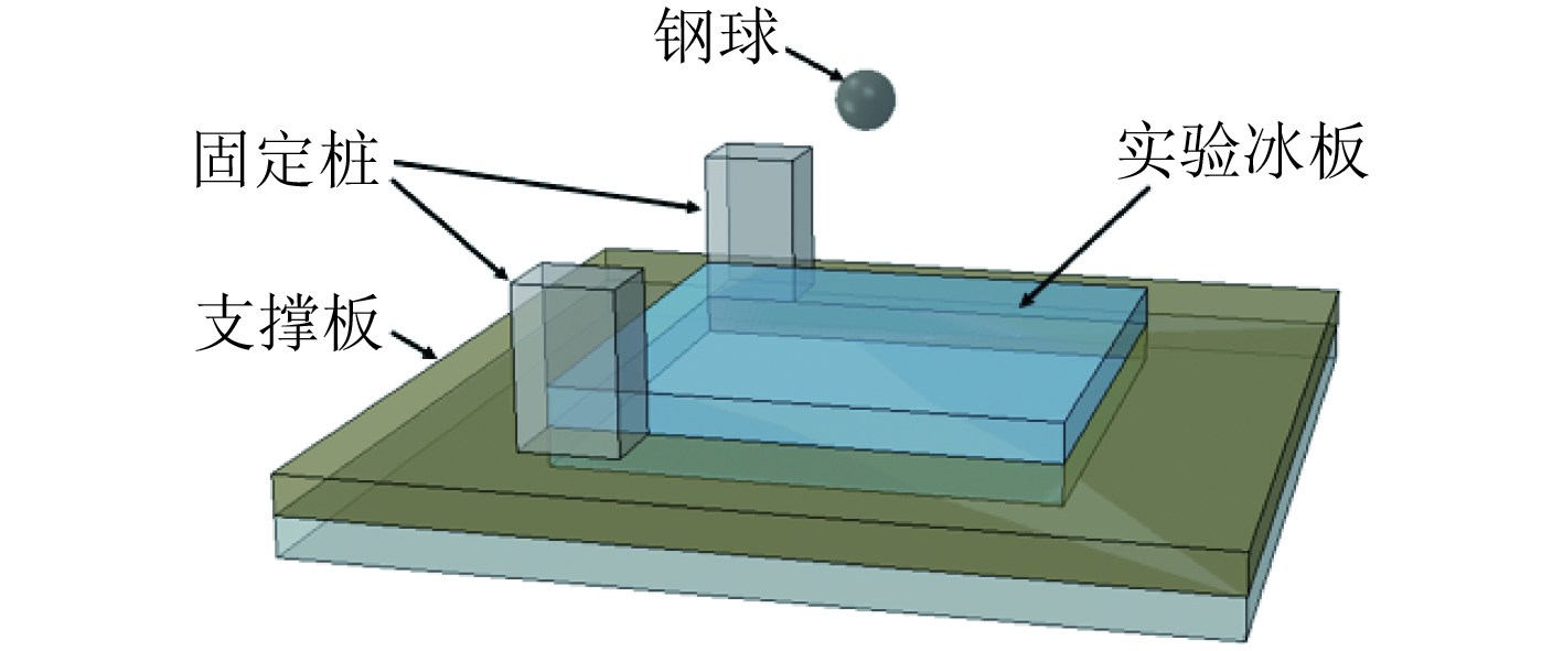 3 数值模型验证 3.1 冰材料模型验证采用Zhang等[12]的实验结果,对高应变率下的冰材料模型进行验证。实验采用落球实验装置,用直径15 mm、质量13.99 g的小球以73.8 m/s的速度撞击厚度10 mm的冰板(见图2)。实验中,冰板与支撑板紧密贴合,支撑板固定,冰板两端位置用固定装置稳定。