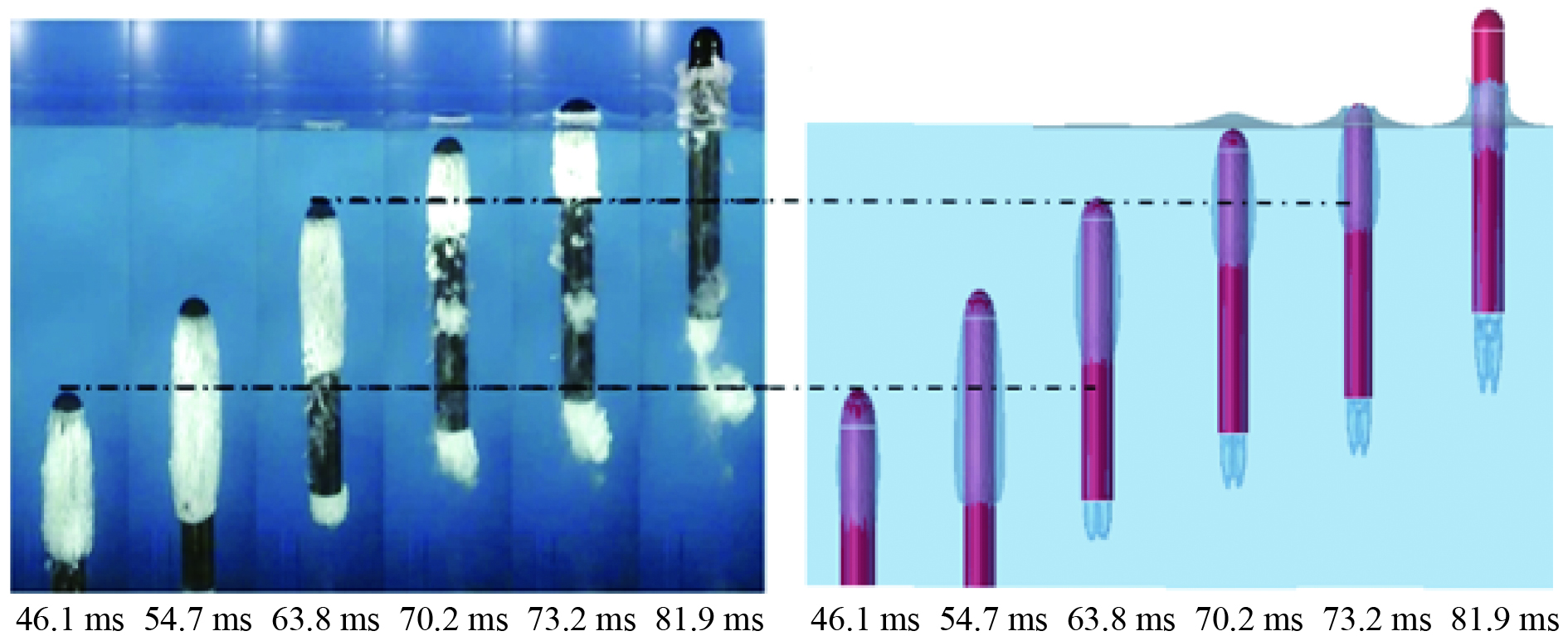 图 7 弹丸水下发射过程中空泡的演化对比 Fig. 7 Comparison of the cavitation evolution during the underwater projectile launching process. |