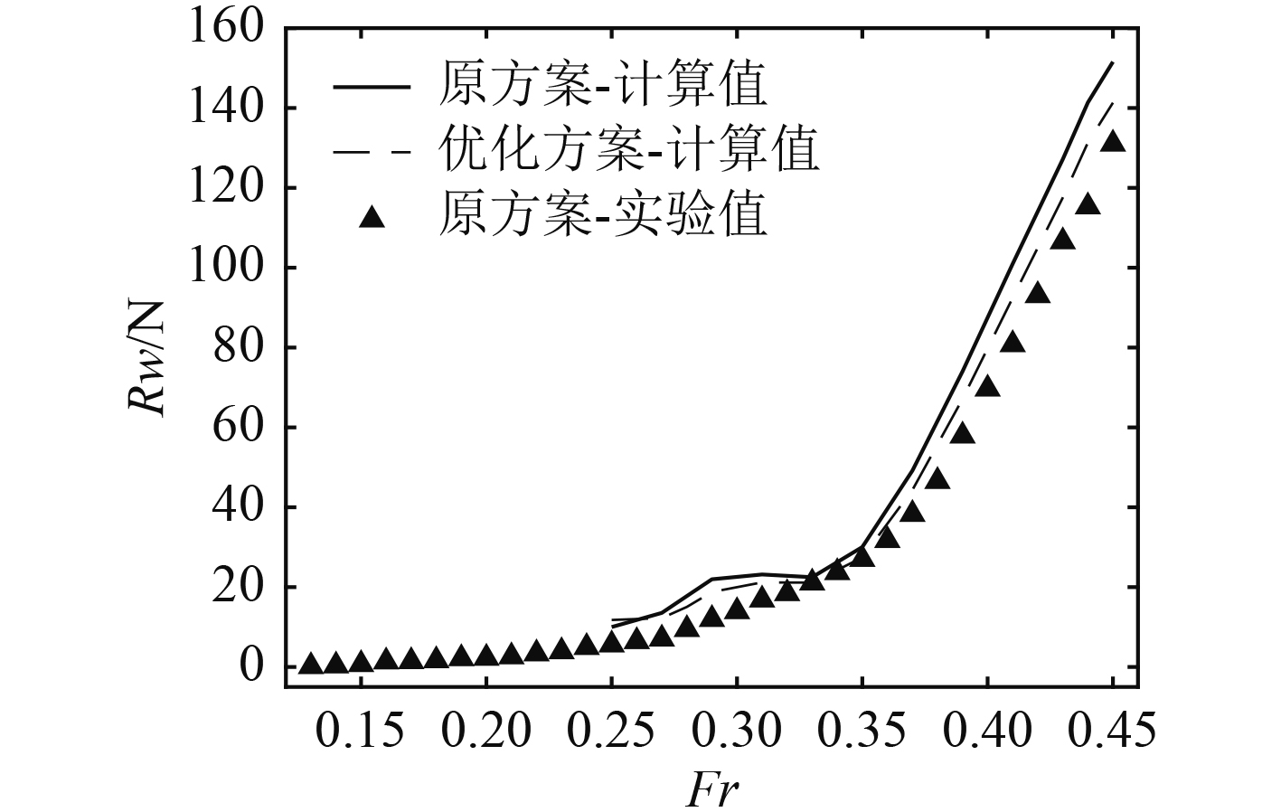 图 4 兴波阻力曲线对比图 Fig. 4 Comparison of wave resistance of the initial and the optimal hull form |