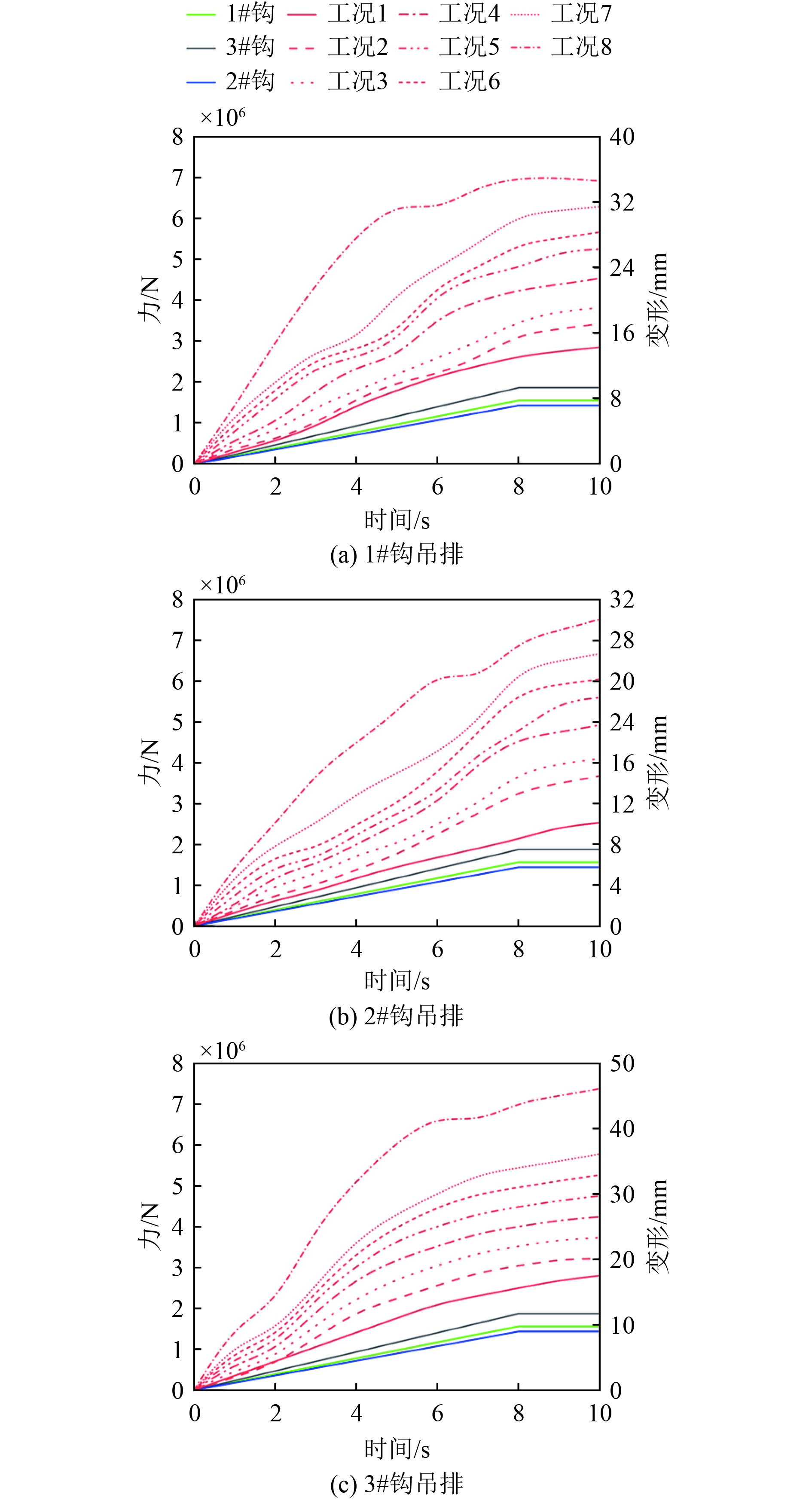 图 10 工况1~8吊排变形结果图 Fig. 10 Deformation results of lifting rows for working conditions 1~8 |