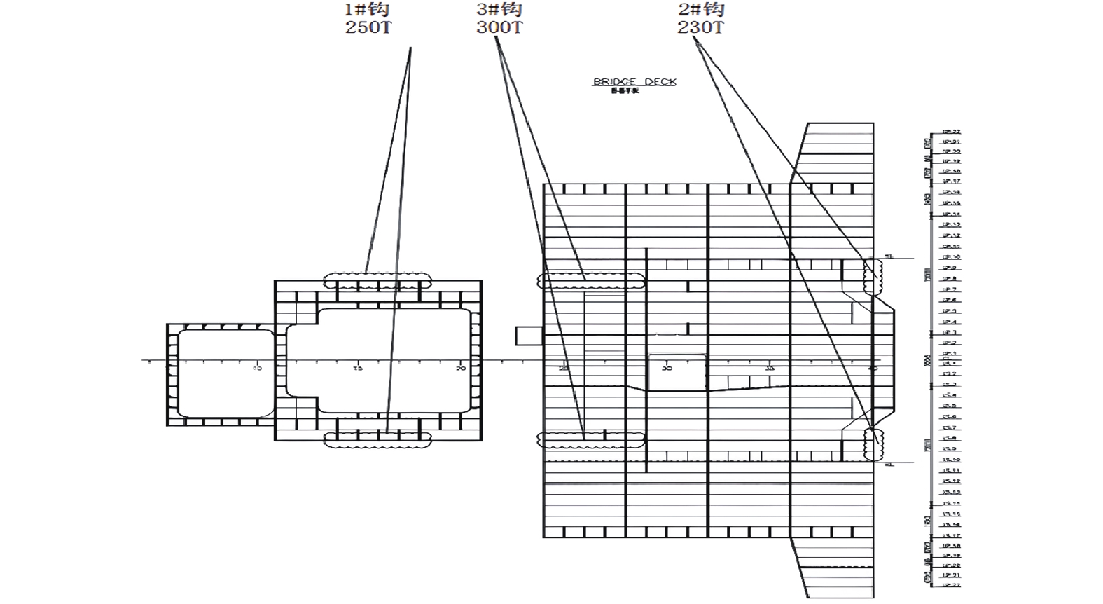 起吊-悬空过程是指在使用起重机等起重设备将船舶的上建从其原始位置吊起并保证上建底部都悬空的操作过程。随着技术进步,传统的吊耳吊装方式在船舶上建中的应用已逐渐减少,目前普遍采用的是吊排吊装技术。通过在吊排的吊孔上施加模拟载荷,来复现上建起吊至悬空状态的过程。在该船的吊装作业中,使用了单台900 t门式起重机。现场操作采用了六个吊点,根据上建的结构特点,在桥楼甲板的左右舷FR14~FR18区域各布置了1个吊排,每个吊排使用4个吊孔,由起重机1#钩进行吊装。在桥楼甲板的左舷FR24~FR28和右舷FR24~FR28区域同样各布置了1个吊排,每个吊排使用4个吊孔,由起重机3#钩吊装。此外,在桥楼甲板FR40处的LP.7~LP10和LS.7~LS10区域也各布置了一个吊排,每个吊排使用4个吊孔,由起重机2#钩吊装。为了确保上建结构的均匀受力和减小吊装引起的变形,吊耳的设计位置应使吊装钢丝绳与甲板平面的夹角不小于60°,以降低钢丝绳的张力并避免吊耳承受过大的横向力矩。吊排的布置及吊装方式的示意图见图3。