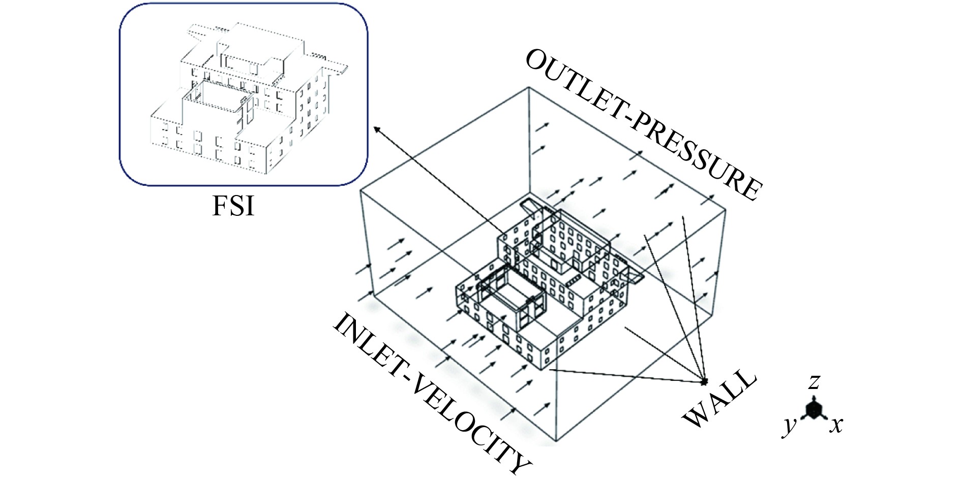 3.3 边界条件边界条件包含入口条件、出口条件以及壁面条件。在设置边界条件时,将壁面边界条件设定为无滑移,同时设定壁面运动条件为静止状态。为了研究流动特性,入口条件设置为速度入口(INLET),出口条件设定为压力出口(OUTLET),流场边界设定为壁面(WALL),并将上建表面设置为流体-结构相互作用面(FSI)。边界条件的设置如图6所示。