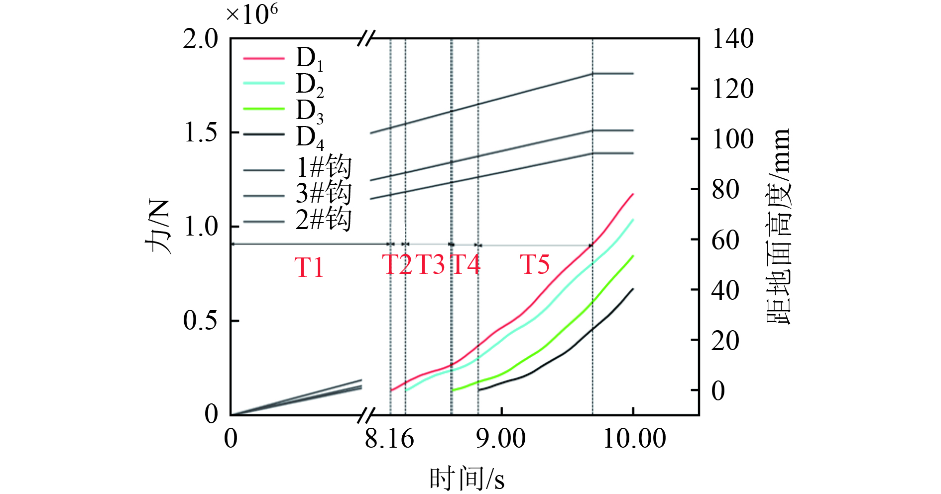 4.1 理想工况理想工况定义为风力等级为0的情况,即工况1。工况1时,上建起吊-悬空过程可以分为第一阶段(T1)从0 s开始,随着施加力的逐渐增加,当施加力达到或超过结构自重时,结构开始起吊。该阶段持续8.16 s,直至D1完全悬空;第二阶段(T2)从8.16 s开始,此时D1逐渐远离地面,直到D2开始悬空;第三阶段(T3)从8.28 s开始,D2继续上升,直到D3开始悬空;第四阶段(T4)从8.64 s开始,D3逐渐远离地面,D4也开始上升;最后,第五阶段(T5)从8.84 s开始,D1、D2、D3、D4全部悬空并吊起,共5个阶段,具体详情如图7~图8所示。图7显示了在力不断增大的情况下,D1、D2、D3、D4位置距地面高度的变化结果,图8为当D1、D2、D3、D4位置分别被吊起时结构的整体应力和变形云图,图9为理想工况下吊排变形以及应力随时间变化结果图,3组吊排的变形量呈现逐渐增大的趋势,均在10 s时达到最大值;应力值呈现先增大后减小的趋势,在7~8 s时达到峰值,随后逐渐减小并趋于稳定。