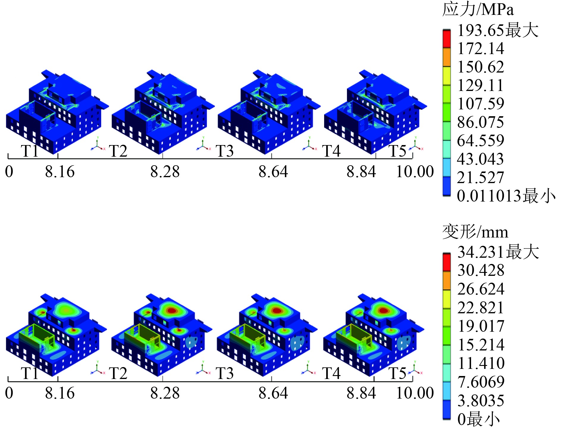 图 8 工况1上建整体应力与变形云图 Fig. 8 Overall stress and deformation cloud diagram built on Case 1 |