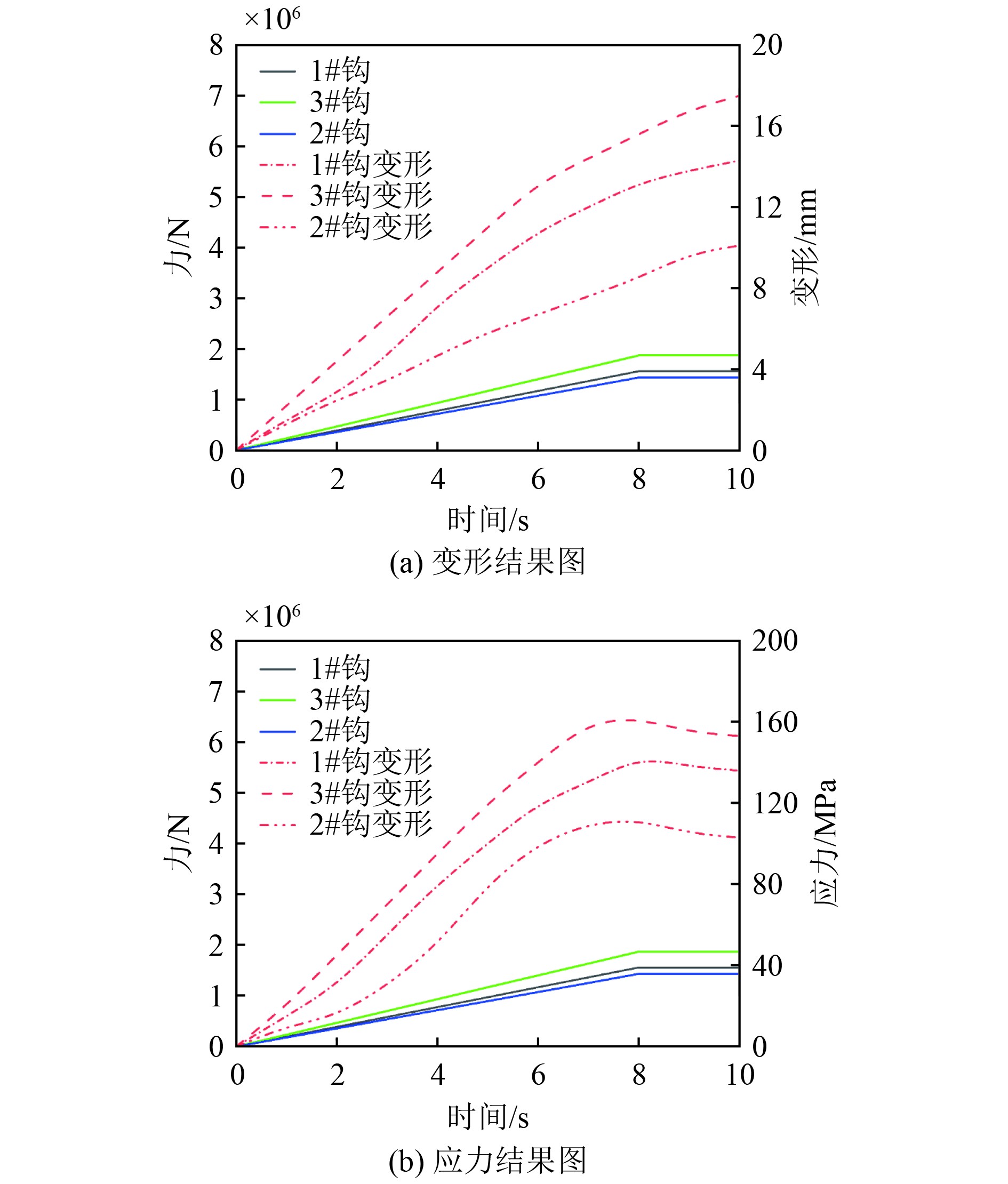 在载荷施加过程中,通过向吊排施加集中力,模拟上建起吊-悬空的过程。载荷分别施加在FR15、FR26和FR40附近的吊排上。3组吊排载荷分别以每秒