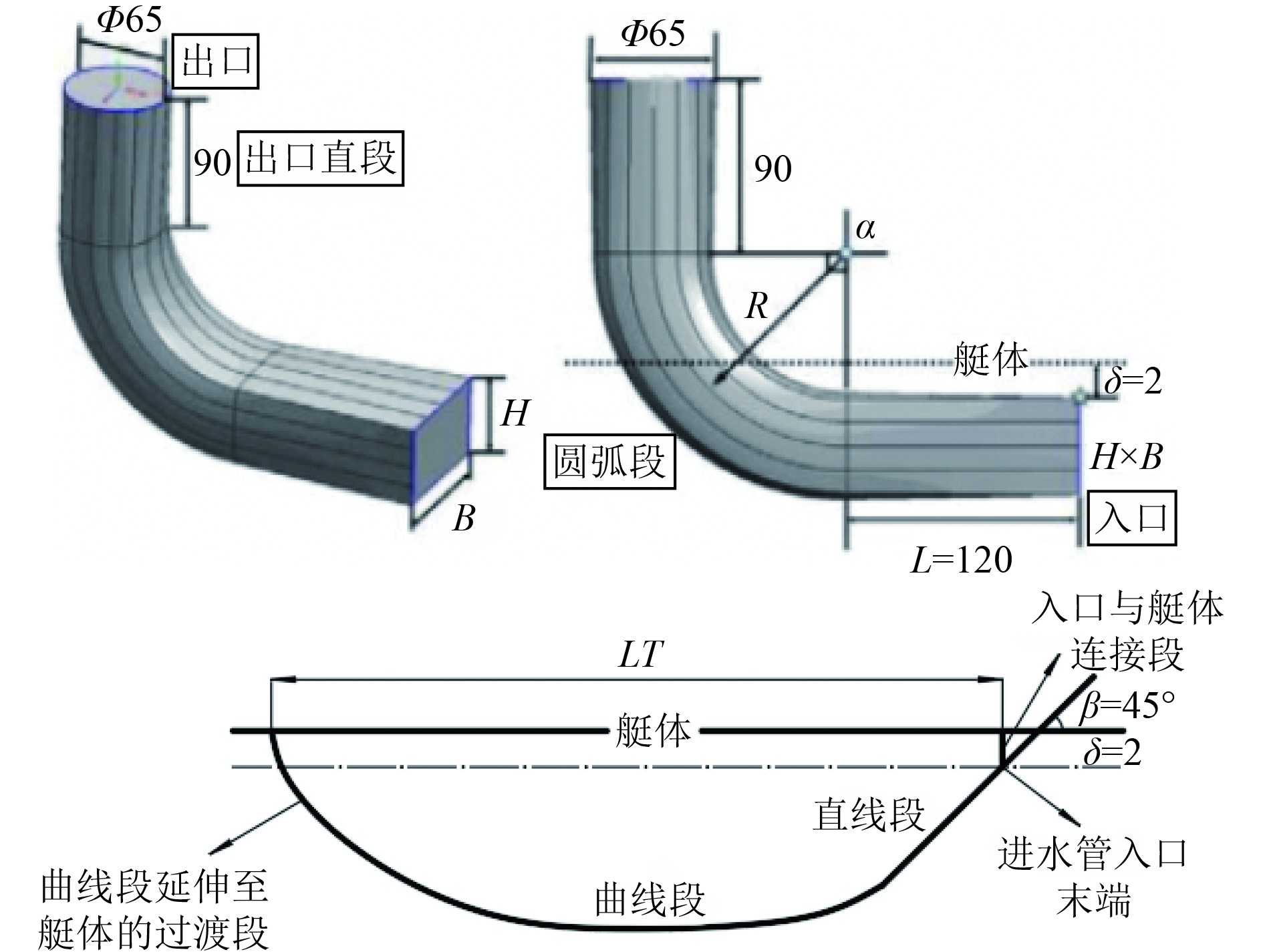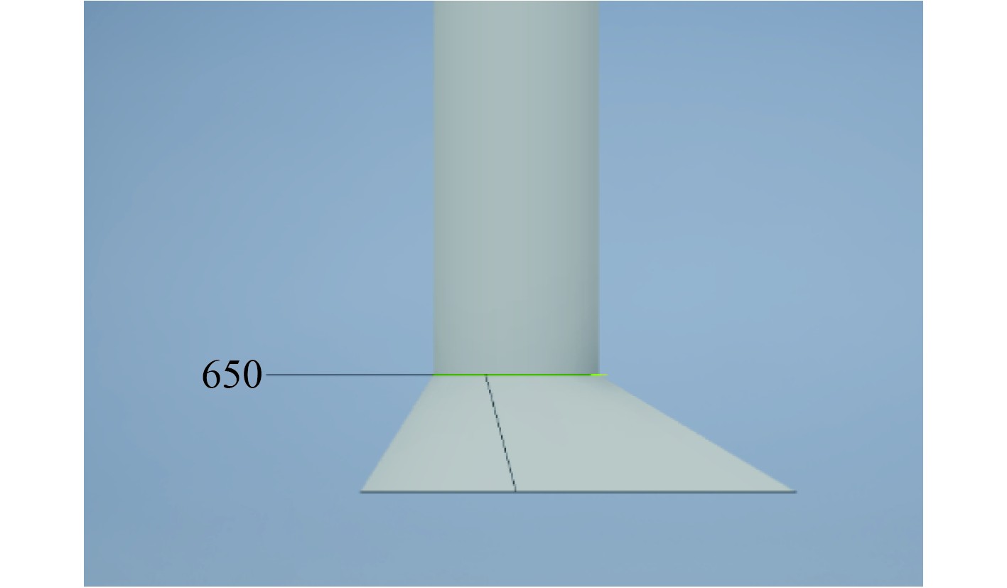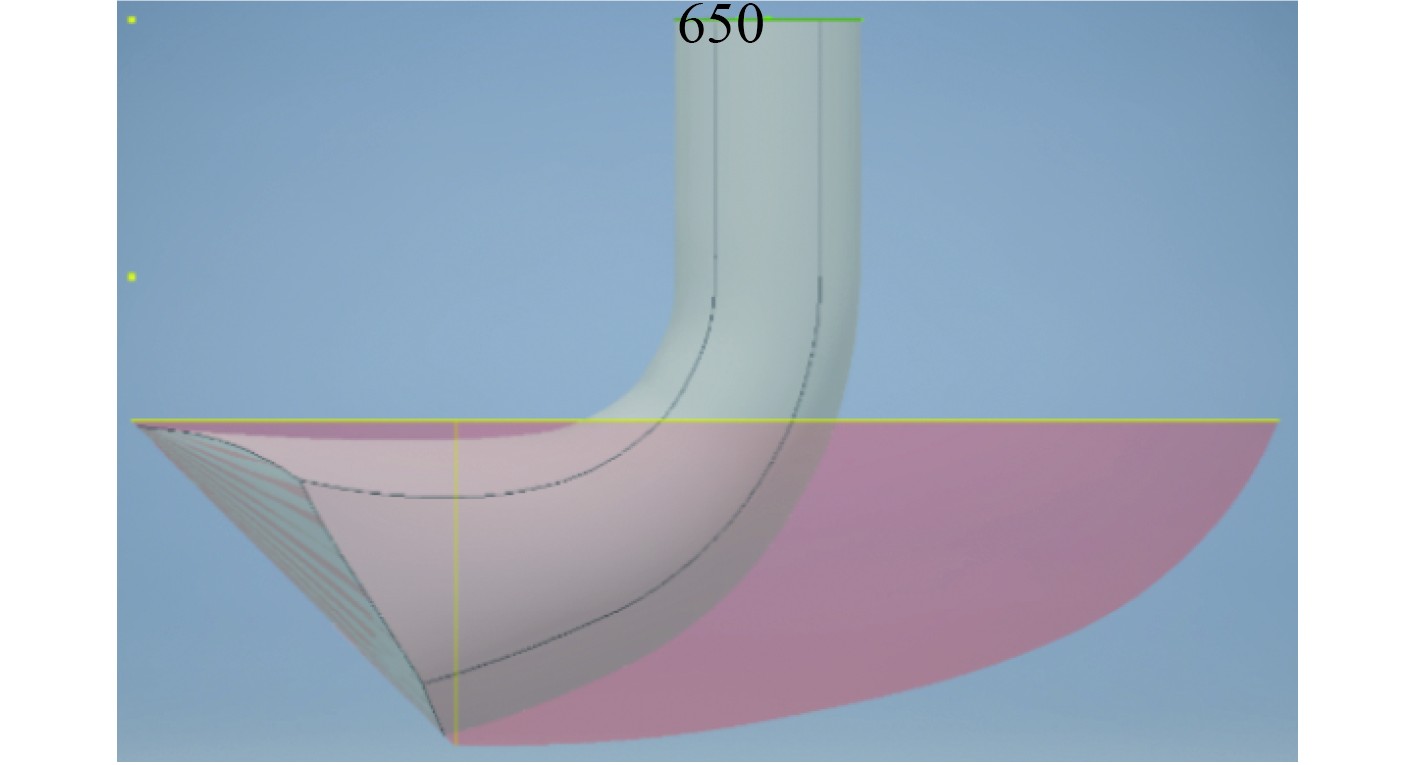 1.2 模型构建对于水下航行器自流管路,基于文献[19]中给出的水下航行器自流系统模型参数,管路入口导流罩按表1和图2进行建模,管道直径为65 cm,如图3所示。在管路出口部分,为了使出口处流场更稳定,去掉导流罩水下斜切部分,管口为向艇后方向渐扩,使管路出口直接连接到航行体表面,进口如图4所示。