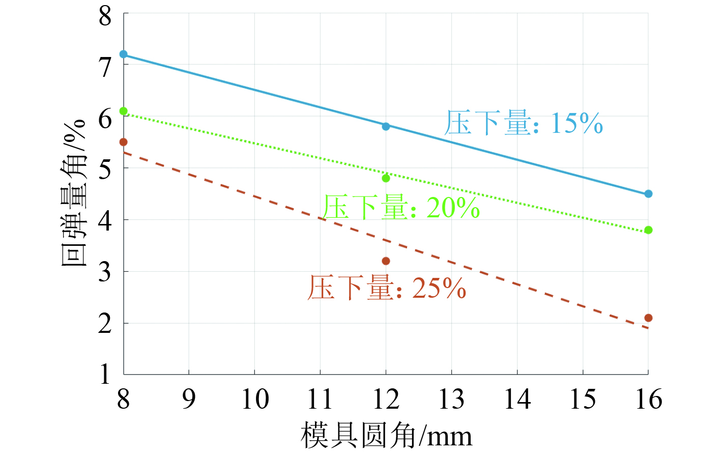 2.2 实验工艺设计针对5083板材的冷压成型工艺优化采用L9(34)正交实验设计。实验选取压下量、模具圆角和摩擦系数作为关键影响因素,其中压下量设置为15%、20%、25%这3个水平,模具圆角设置为8、12、16 mm这3个水平,摩擦系数设置为0.06、0.09、0.12这3个水平。以回弹量和表面粗糙度作为主要评价指标。由图1可知,随着模具圆角增大,回弹量线性下降,且压下量越大,回弹量随模具圆角增大的下降速率越快,表明高压下量与大模具圆角的工艺组合,对降低冷压成型的回弹量具有更显著的效果。