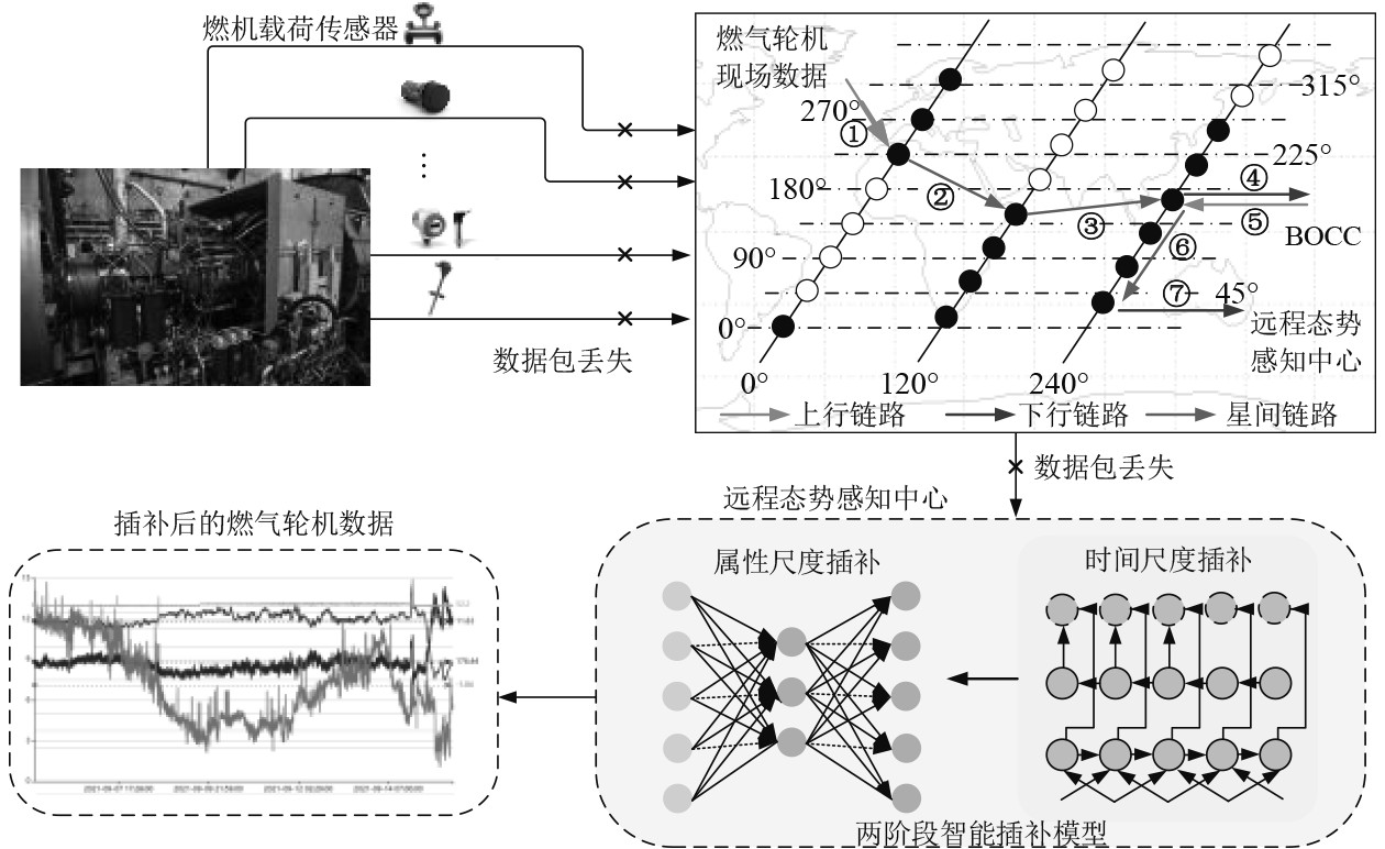 由于现场端与远程态势感知中心不被同一颗卫星覆盖,需要通过上行链路、星间链路、下行链路进行中继传输,图1中链路编号代表数据中继传输顺序,北斗三代卫星系统中仅14颗具备通信能力,图中以黑色实心球标注,且依照我国北斗卫星短报文通信管规定,所有短报文需经过北斗卫星导航系统的运营控制中心(BOCC)转发。在燃机数据以电磁波方式在空间传输时,不可避免出现数据包丢失情况,远程态势感知中心则负责执行本文所提两阶段智能插补模型,分别在时间和属性尺度挖掘多元数据间的潜在逻辑,保障船舶燃气轮机态势感知数据的完整性。