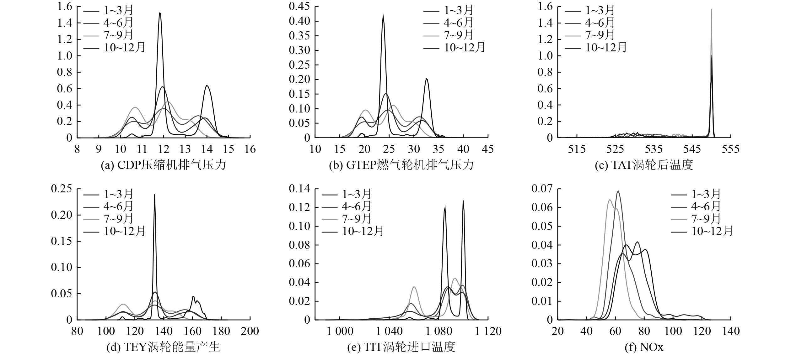 可以发现在每年不同季节下的燃气轮机多元变量具备不同的高斯分布特性,对于CDP、GTEP、TIT而言,存在2~3个显著峰值,且1~3月的变量数值明显高于其他季节。对于TEY、NOx而言,变量的分布特性波动较小且NOx的季节特性显著。TAT无论在何种季节,均保持非常稳定的涡轮后排放温度。