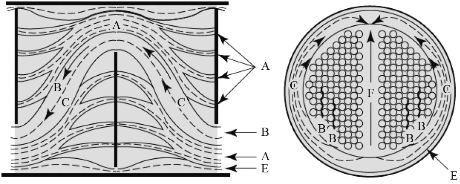 折流板作为管壳式换热器壳程的支撑元件,不仅对换热管起支撑固定作用,而且能从拓展换热面、改善流道、诱导湍流等方面增强换热效率,对管壳式换热器壳程特性产生很大影响[5],其中Wen等[6]、Marzouk等[7]与Yousef等[8]采用数值仿真方法对不同折流板类型、切口大小以及挡板间距的流场特性、压力损失和传热性能进行对比分析,相关研究已较为充分。与此同时,很多学者针对折流板与壳、折流板与管之间的间隙对换热的性能开展较多的试验研究。对管壳式换热器壳程空间流路分布的描述,如图1所示[9]。A为通过管外径和折流板管孔之间间隙的泄露流;B为通过折流板和横流的主流;C 为流经管束外径的旁路流;E为在壳体内径和折流板外径之间间隙的泄漏流;F为由于管通过隔板中遗漏管子而导致的旁路流;Roetzel等[10 - 11]通过试验证明了A和E泄漏流会影响压降和局部传热,降低换热效能,A流程相对E流程对降低压降和传热效率的影响更大;Jiang等[12]、Tahery等[13]、Zając等[14]通过一系列试验研究表明E流程间隙会使传热性能降低了约15%。